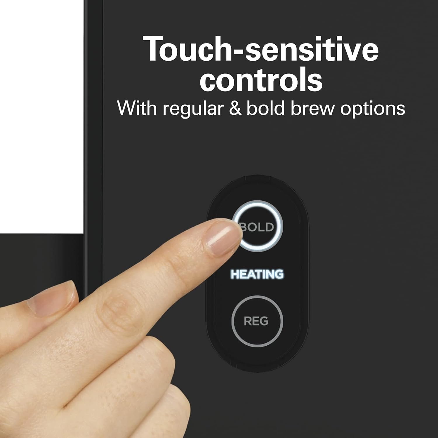 TOUCH-SENSITIVE CONTROLS WITH REGULAR AND BOLD BREW OPTIONS: The capacitive-touch controls on this single serve drip coffee maker are sensitive to a light tap, making it easy to select settings, such as brewing coffee with regular or bold strength.