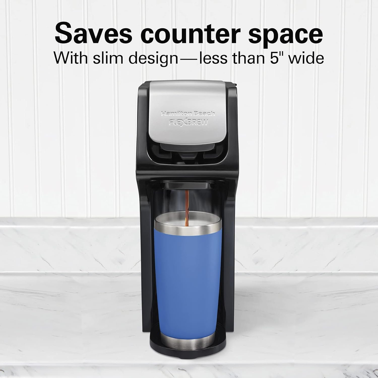 Brew a cup of hot, delicious coffee with the Hamilton Beach® FlexBrew® Single Serve Coffee Maker and enjoy the flexibility of brewing two ways. Simply add your favorite pod, such as a K-Cup* pod, or coffee grounds. Add water, lower the lid, and press a button — your coffee will be ready in about 2 minutes. This one cup coffee maker allows brewing up to 10 oz with a pod and 14 oz with grounds. The slim design of this single serve coffee machine fits compact kitchens and countertops, measuring less than 5 inches wide. Its capacitive-touch controls offer simple operation, including options for regular and bold brewing. The 14 oz water reservoir is easy to fill, and the removable cup rest accommodates a standard-sized cup or a 7″ travel mug. This versatile appliance holds either the pod holder or single-serve brew basket for use with various coffee pods and filters. Frequently used by coffee enthusiasts, office workers, students, and busy professionals, it performs well as an office coffee maker or everyday coffee brewer. With a compact footprint and reliable performance, it’s a practical choice for anyone seeking pod coffee makers, one cup coffee makers, or compact coffee maker machines.