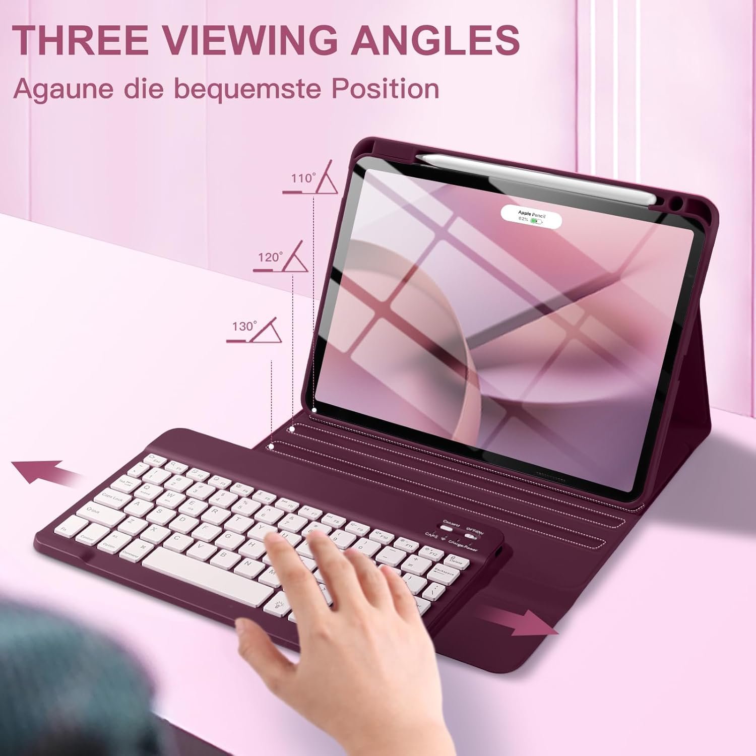 ❤【Adjustable Viewing Angle】There are 3 anti-slip grooves design inisde of the case for iPad air keyboard case provides the perfect stand angle. which you can change where the tablet is on the case and adjust the screen angle this way for drawing or writing on, browse the web or do more