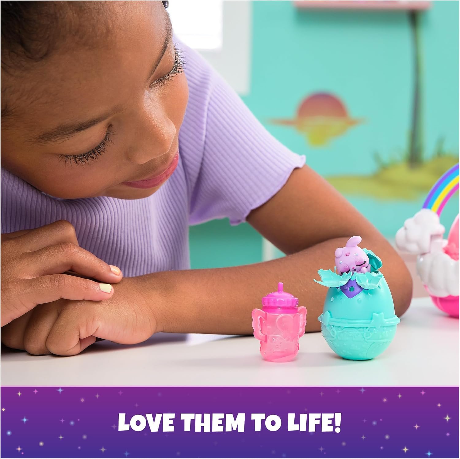 3 self-hatching eggs: Nurture the eggs & begin the hatch by feeding them. Remove the pacifiers, fill the bottle with water, squeeze it into each Hatchimals egg & 3 friends will hatch before your eyes
