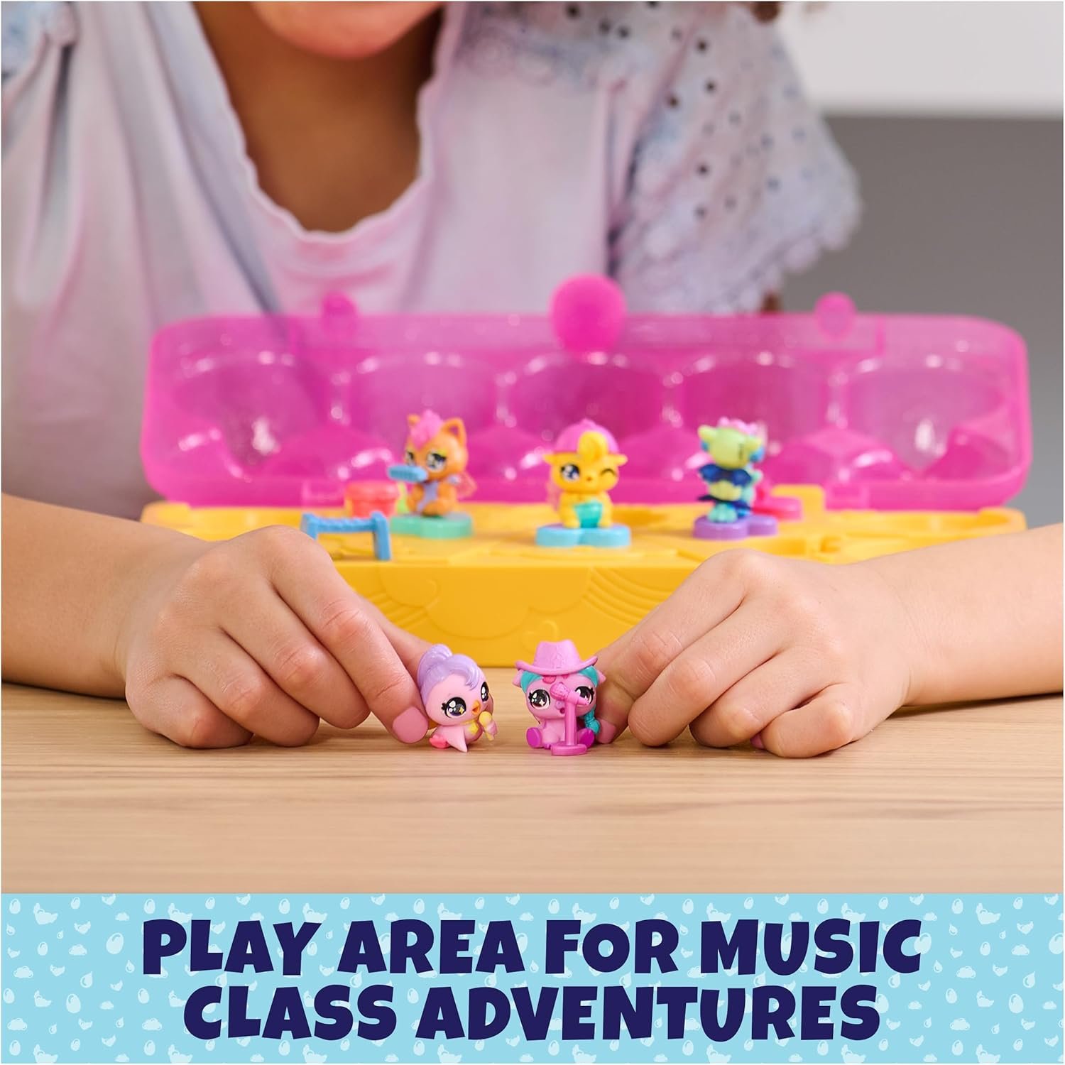 Experience music time fun with the Hatchimals Alive Carton. With your love and care, super cute Hatchimals Alive characters magically come to life in a whole new way. Their self-hatching eggs hatch like real eggs when activated by water. Push to open the pink lid to discover five colorful Hatchimals eggs with 11 accessories and six characters, including new DJ dragon twins. To start hatching, remove the pacifiers from the eggs, fill the bottle with water and squeeze it into the eggs. In seconds, your friends will start revealing, cracking through the eggs. Display your Hatchimals inside and use your imagination to create music class adventures. A microphone, drum, kazoo, and more accessories add to your storytelling – plus, the pacifiers fit in each character’s mouth. Close the lid and lock the carton to take your Hatchimals on-the-go. For more ways to play, look for the Hatchi-Nursery Playset (sold separately). Those who enjoy collectibles, action figures, small toys, dolls, and doll house play will love Hatchimals toys for kids. For ages 3 and up, Hatchimals surprise toys for girls and boys are fun Easter basket toys, birthday gifts or gifts for any occasion. Experience music-themed storytelling with the Hatchimals Alive Carton.