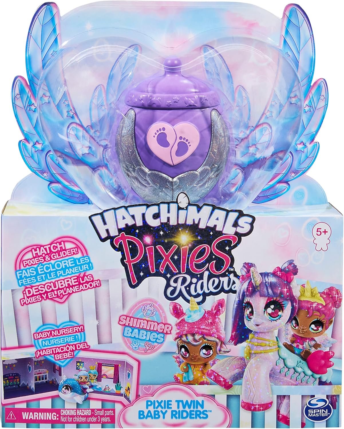 Discover the most adorable Hatchimals Pixies Twin Baby Riders! These super cute Shimmer Babies Pixie Twins feature sparkly details, fluttery wings, and poseable heads, and come with a baby Hatchimals Glider they can really ride. The Shimmer Babies Pixie Twin Baby Riders have a magical unboxing experience. Remove the wings from the bottle egg and hatch the heart to reveal your sweet twins and four accessories, including pacifiers for your twins and Glider, and an accessory! Next, slide the box out of its sleeve and open the nursery inside! Discover your majestic baby Hatchimals Glider featuring iridescent and sparkly details. Accessorize your Pixie Twins and Glider, then attach the wings to the back of the bottle egg and transform it into a crib that really rocks! Once you’ve unboxed and accessorised your Pixies and Glider, the box becomes a nursery playset – it’s the perfect way to add to your pretend play storytelling. When you’re finished playing, close the box and take it with you anywhere you go! With two sets of Hatchimals Pixies Twin Baby Riders available to collect (each sold separately), add them both to your collection! Hatchimals Shimmer Babies CollEGGtibles and Pixies toys are great gifts for kids aged 5 years and up. Ride into adventure with your own set of Hatchimals Pixies Shimmer Babies Twin Baby Riders!