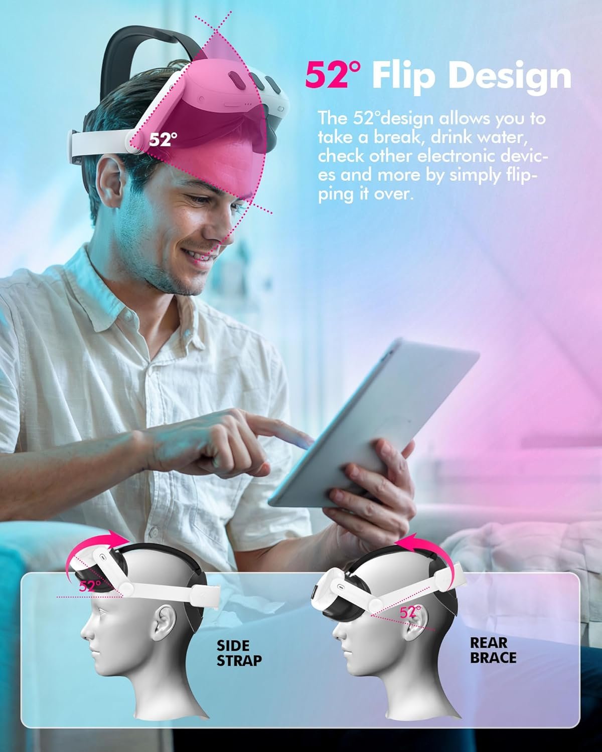 Flip Design for Easy Access: The 52° flippable hinge allows you to easily flip up the VR headset without removing the entire strap, providing quick access to the real world. This design is especially user-friendly for VR game developers and glasses-wearers.