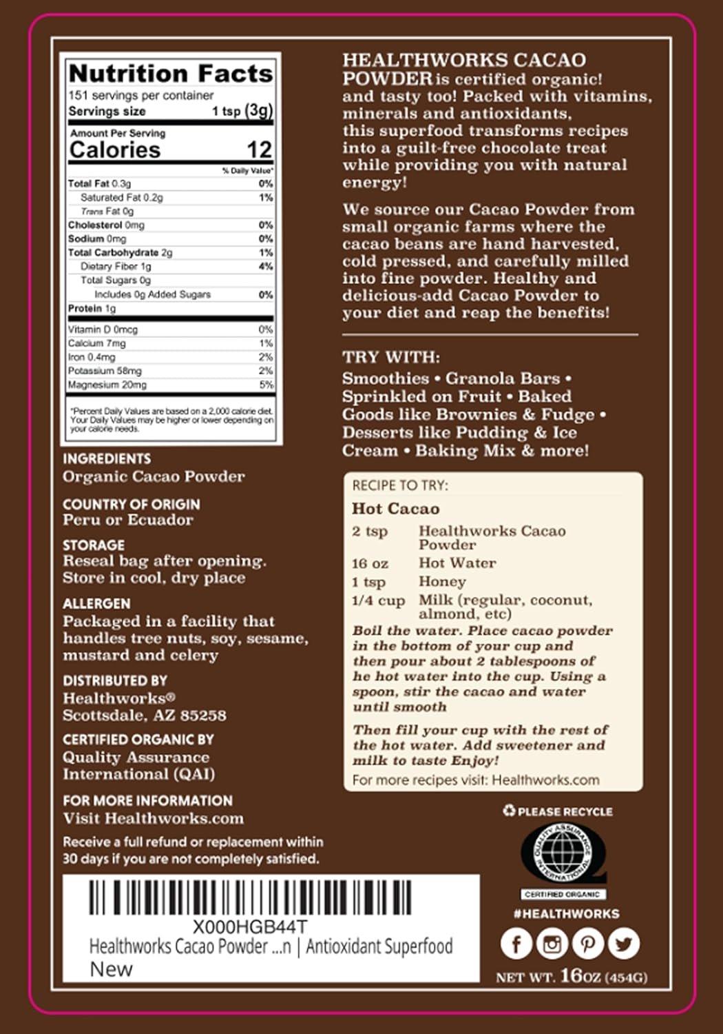 MANY BENEFITS & NUTRIENTS: A guilt-free nutrient dense Superfood that contains a rich supply of plant-based antioxidants, magnesium, calcium, zinc, iron, copper, potassium and is low in carbohydrates and sugar-free. Containing Theobromine, a powerful stimulant naturally present in raw cacao, Healthworks Cacao Organic Powder provide an all-natural jitter-free energy boost similar to caffeine in coffee!