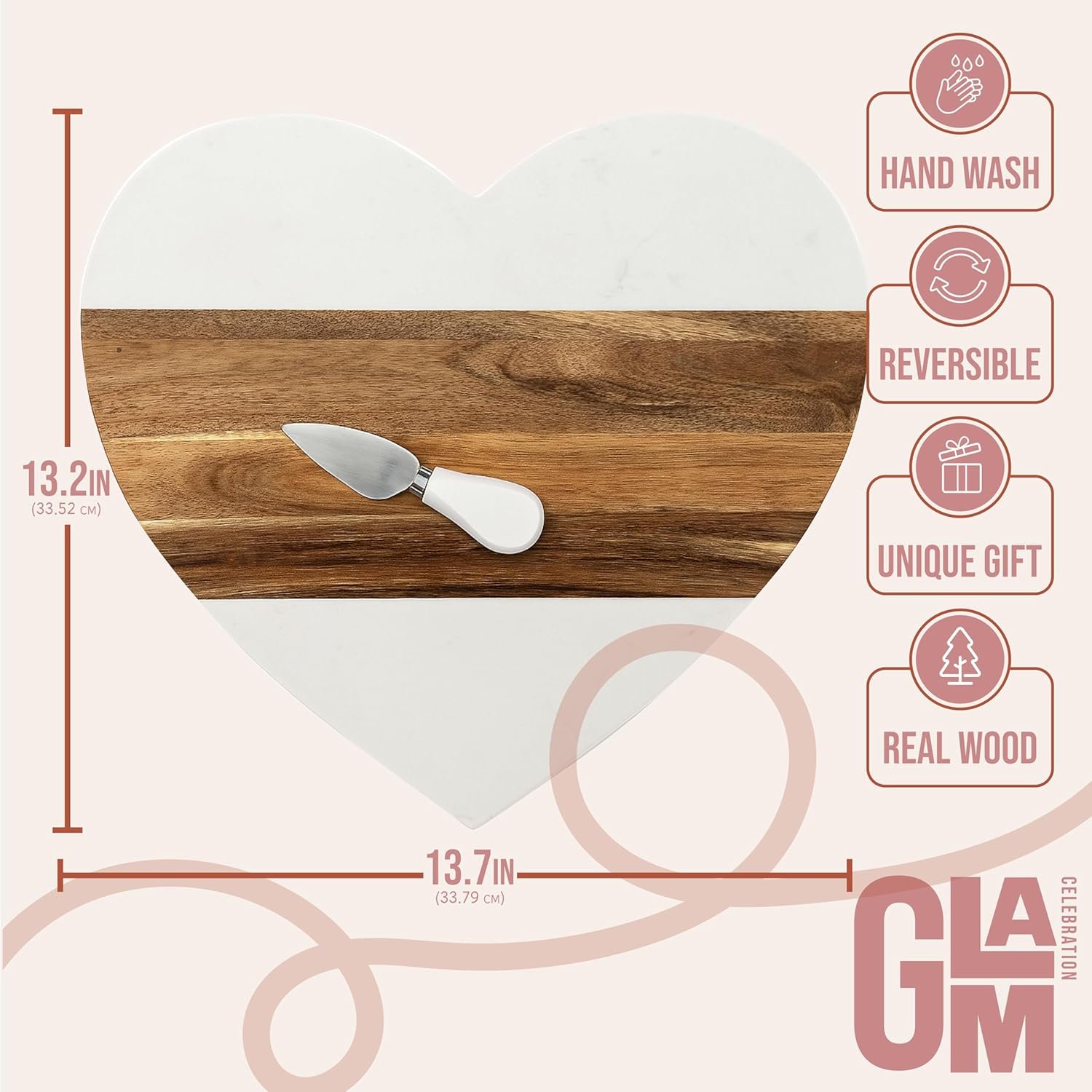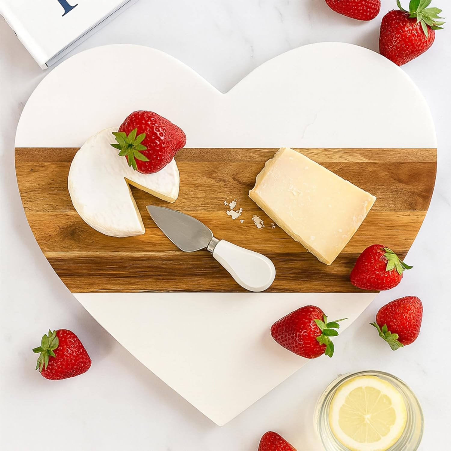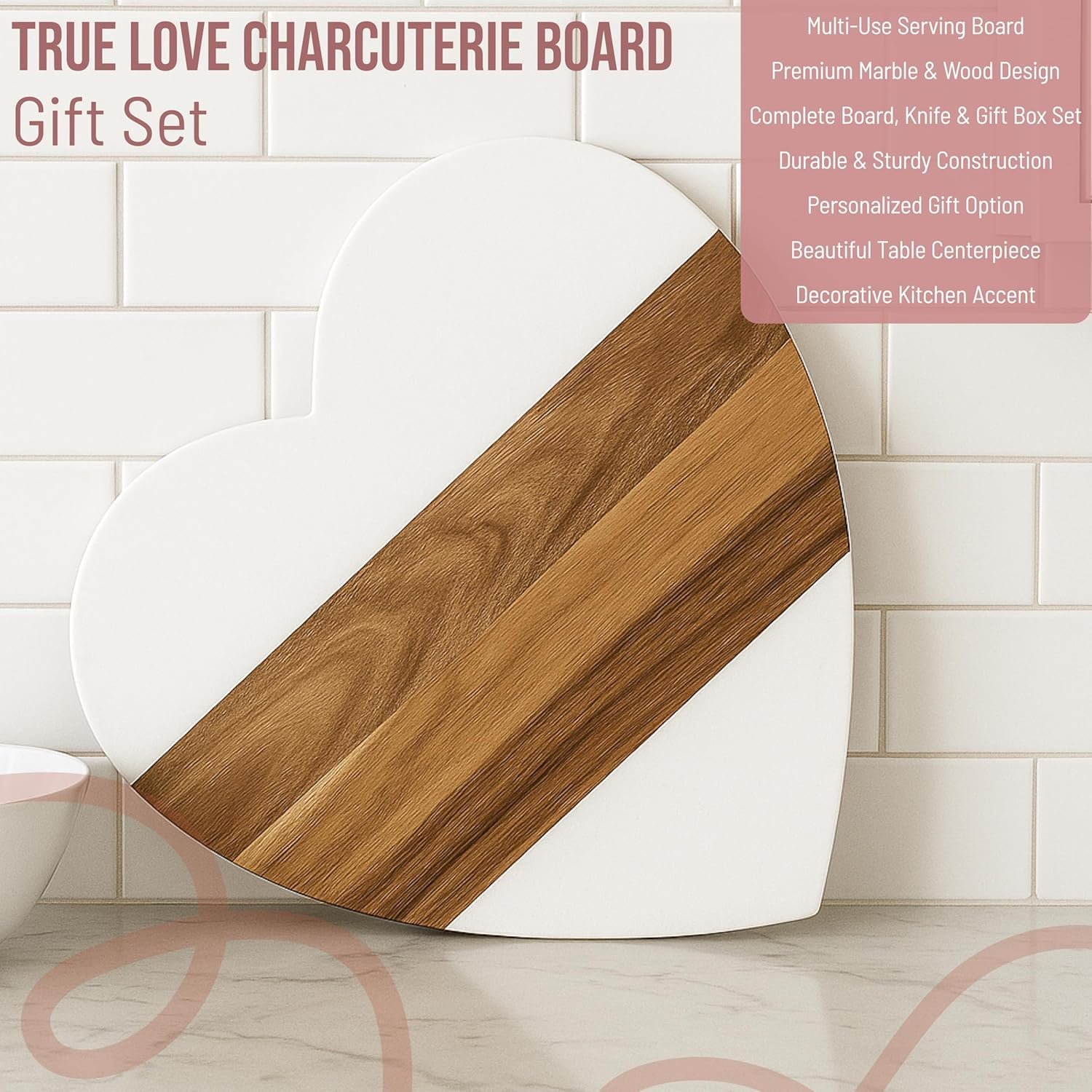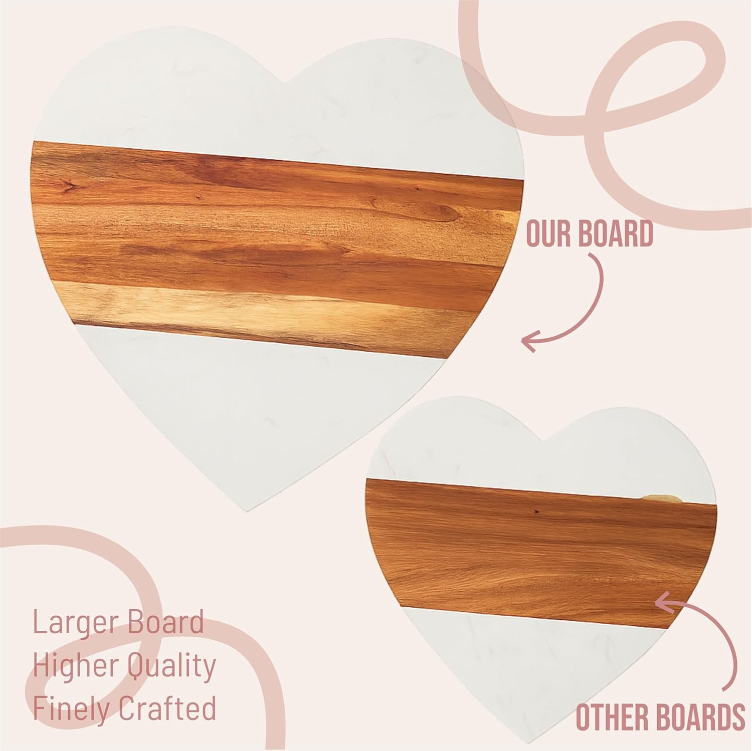 Heart-Shaped Board Gift Set – Includes acacia wood and marble charcuterie board with cheese knife, cute charcuterie board arrives in gift box ready for couples or hosts