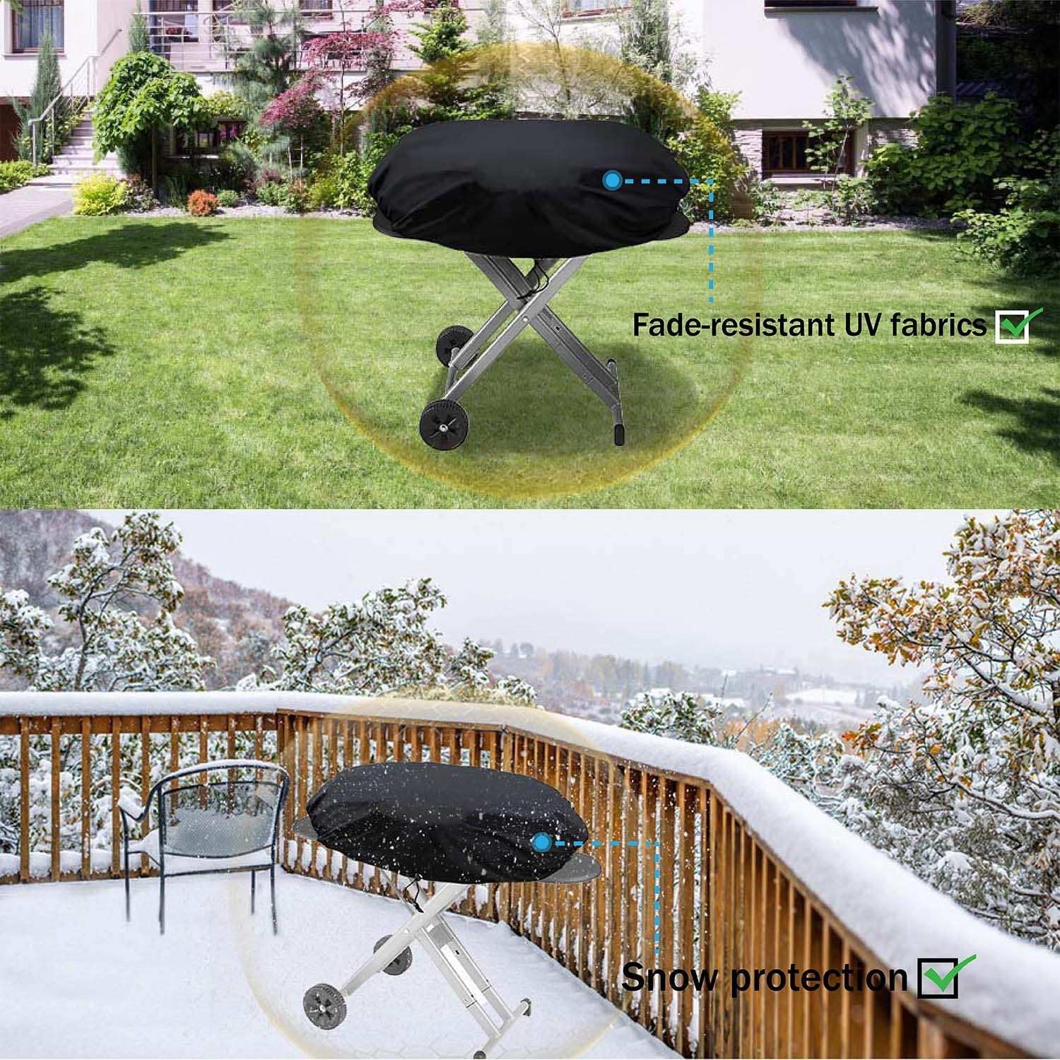 【WIND-PROOF and SAFE】- This small grill cover has an adjustable drawstring on the bottom and fastening straps on both sides to keep the grill cover in place during strong winds. Never worry about your grill cover being blown away by strong winds again.