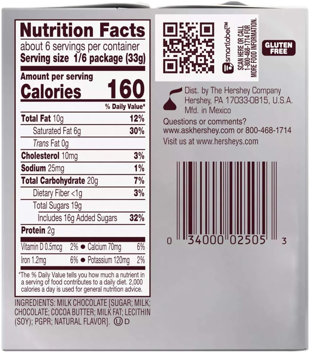 Contains one (1) 7-ounce HERSHEY’S KISSES Solid Milk Chocolate Candy in a gift box