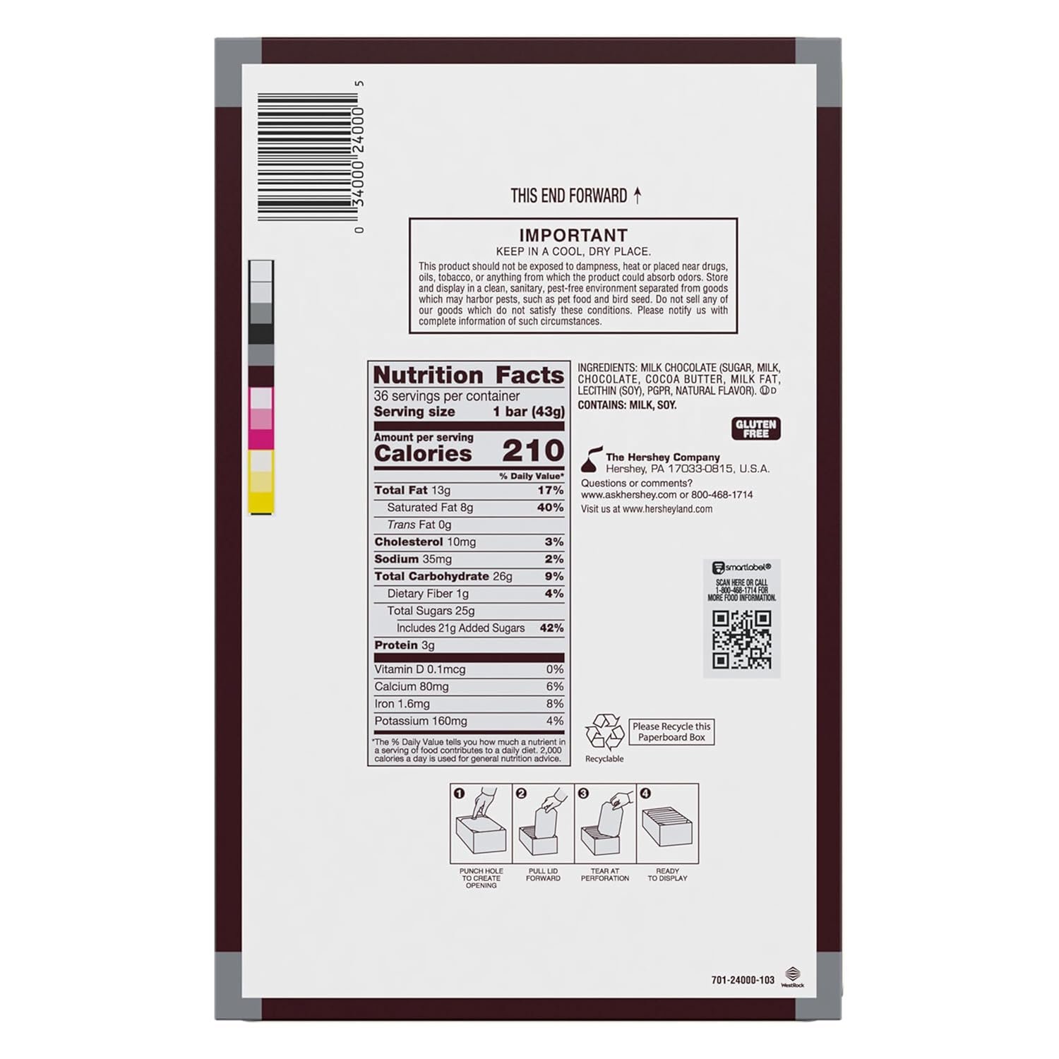 Contains thirty six (36) 1.55-ounce HERSHEY’S Milk Chocolate Candy Bars in a bulk box