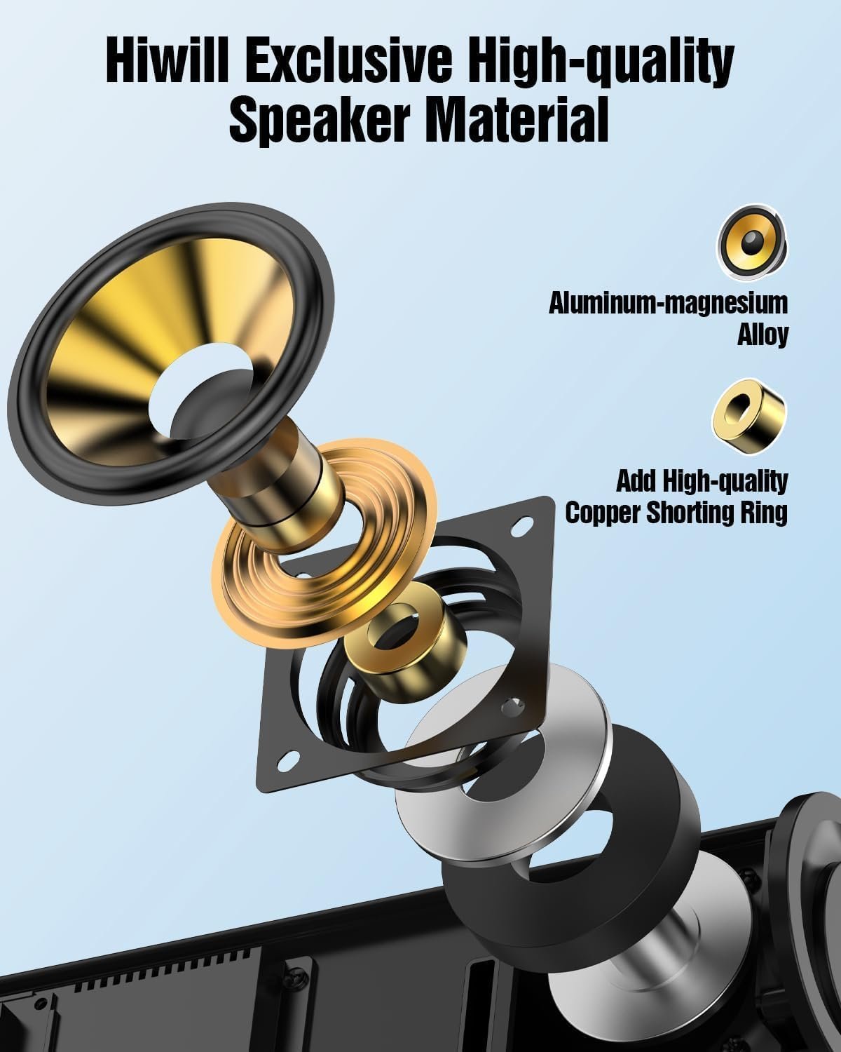【Crafting Superior Sound with Premium Materials】Delivers exceptional audio through superior craftsmanship and premium materials. Featuring high-end aluminum-magnesium alloy diaphragms, the system ensures optimal sound quality with lightweight design, excellent conductivity, and high rigidity. Each driver is enhanced with the copper shorting ring to reduce interference and improve signal clarity, creating a truly immersive, high-quality audio experience.