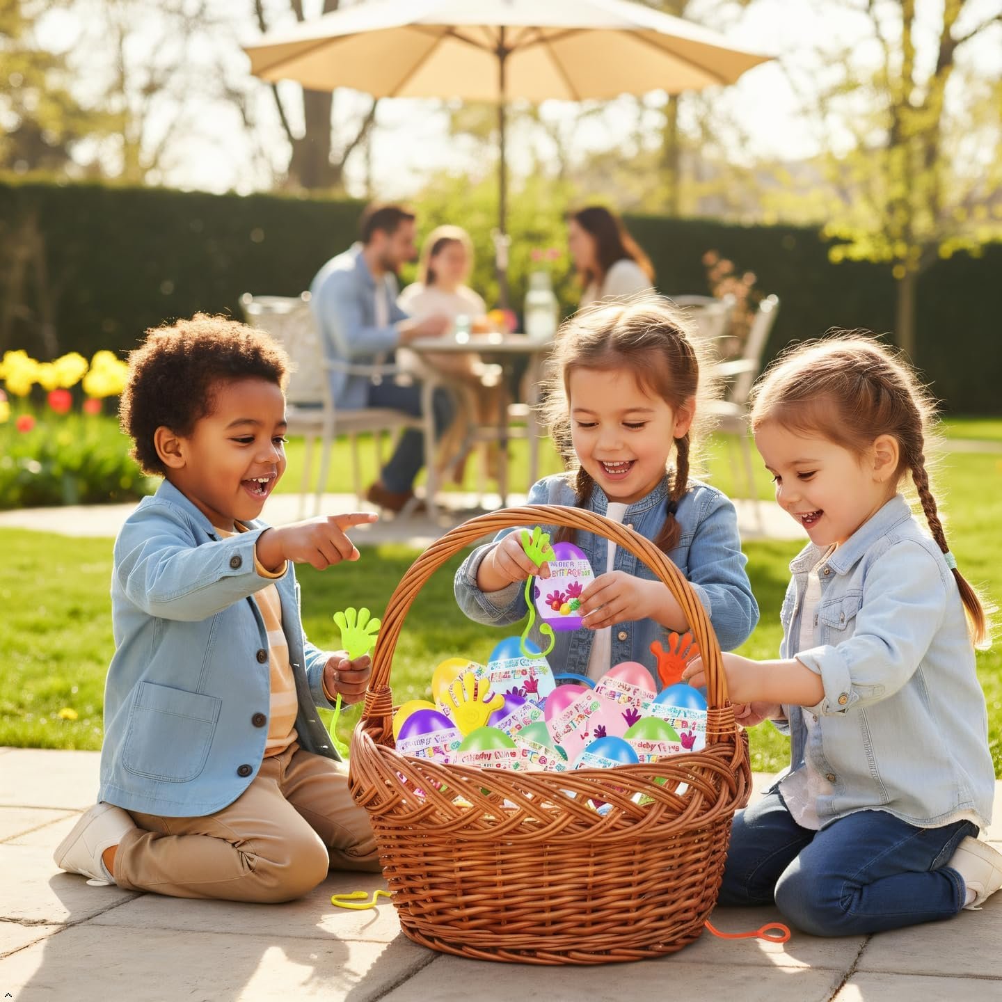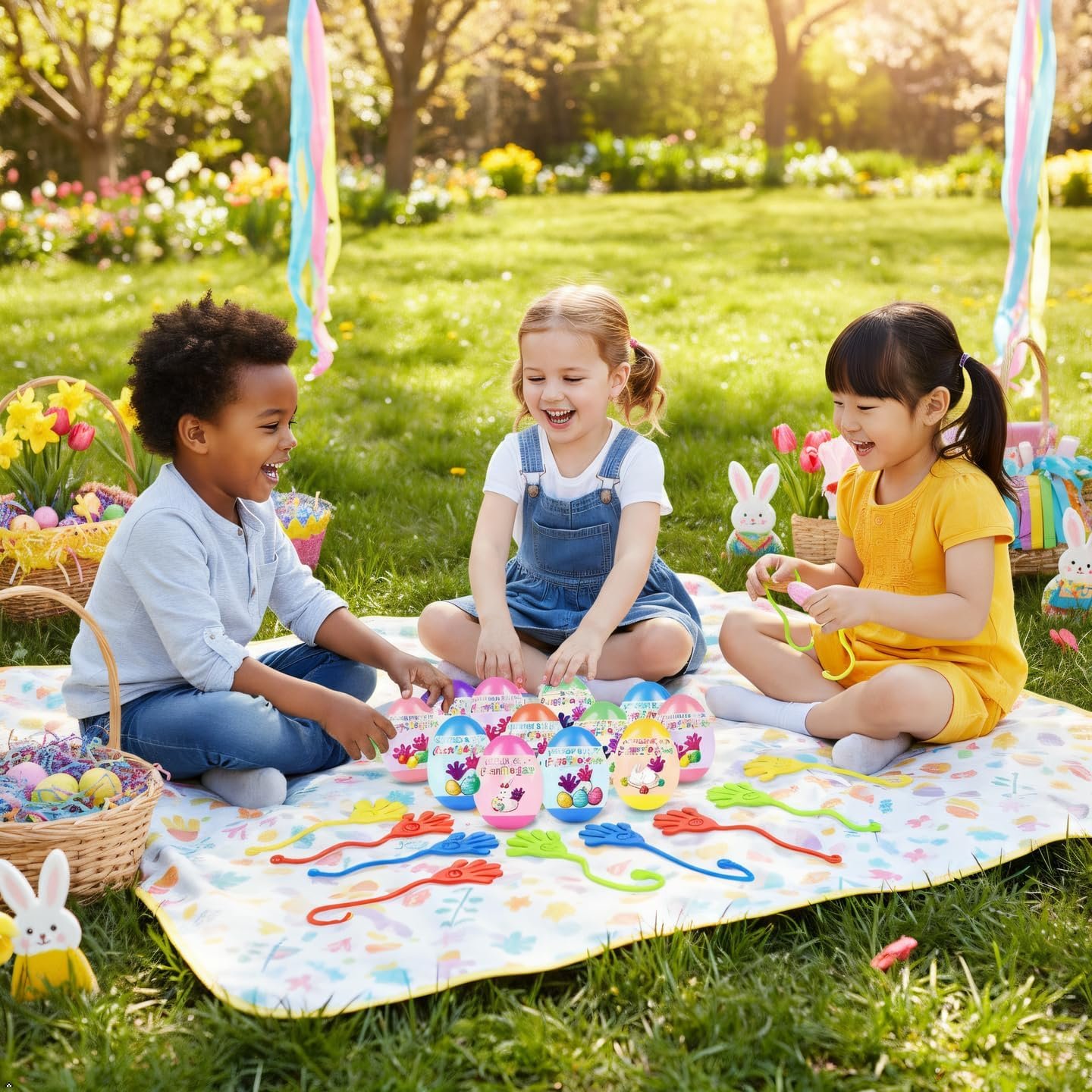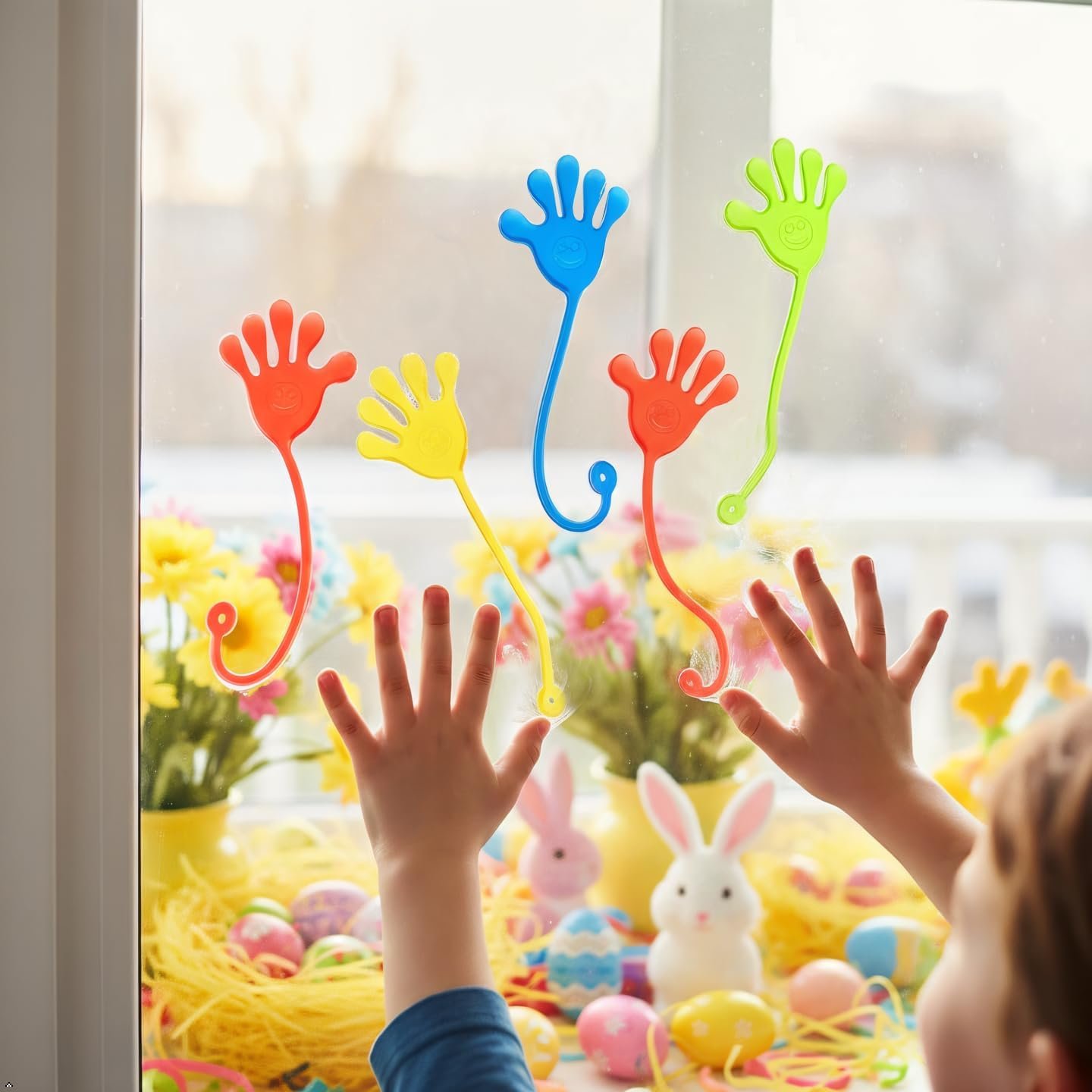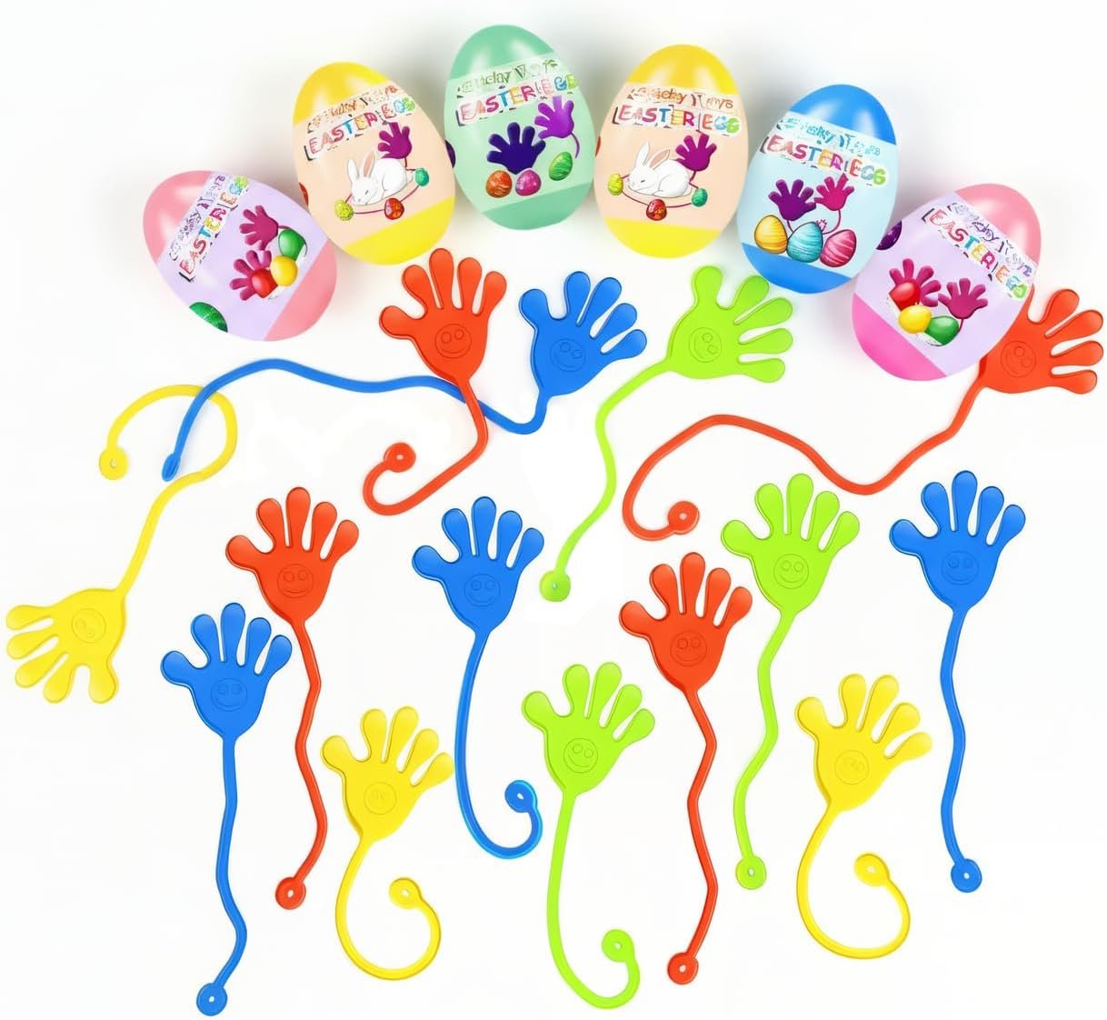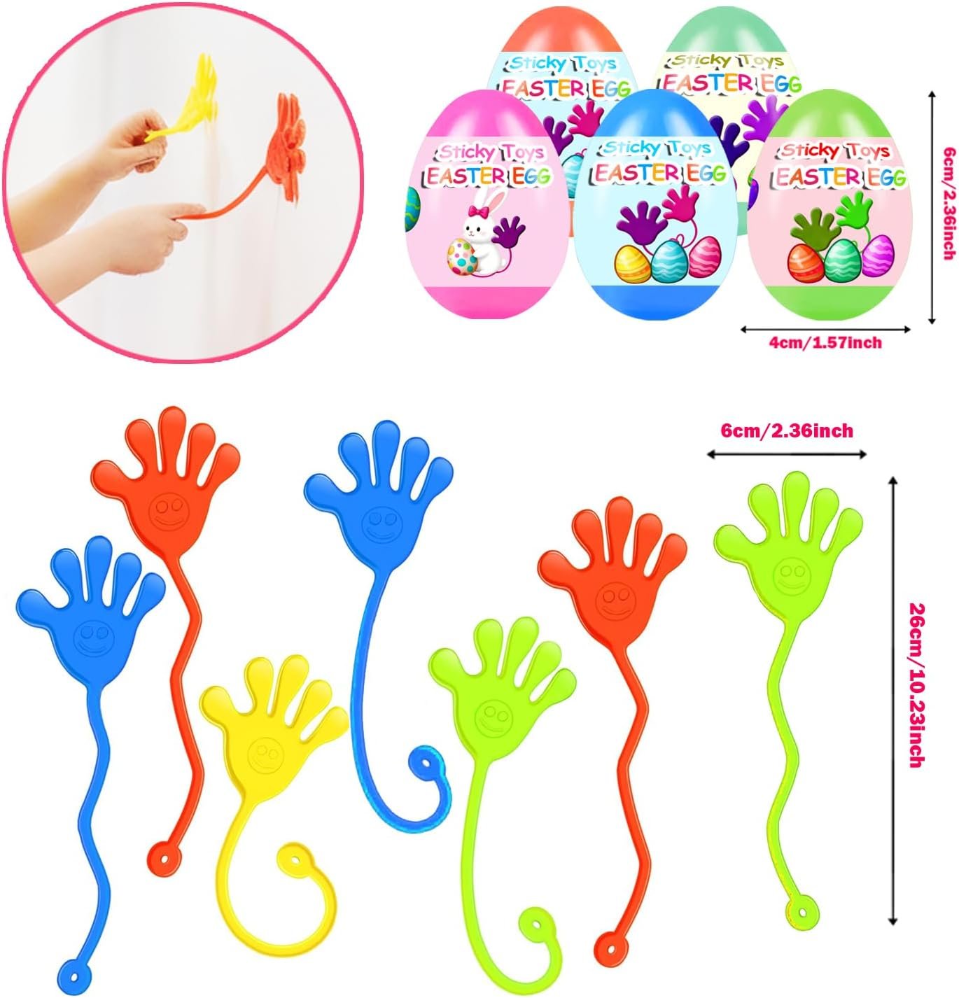 PACKAGE CONTENTS: Set of 24 colorful pre-filled Easter eggs, each containing a fun sticky hand toy perfect for Easter celebrations and parties