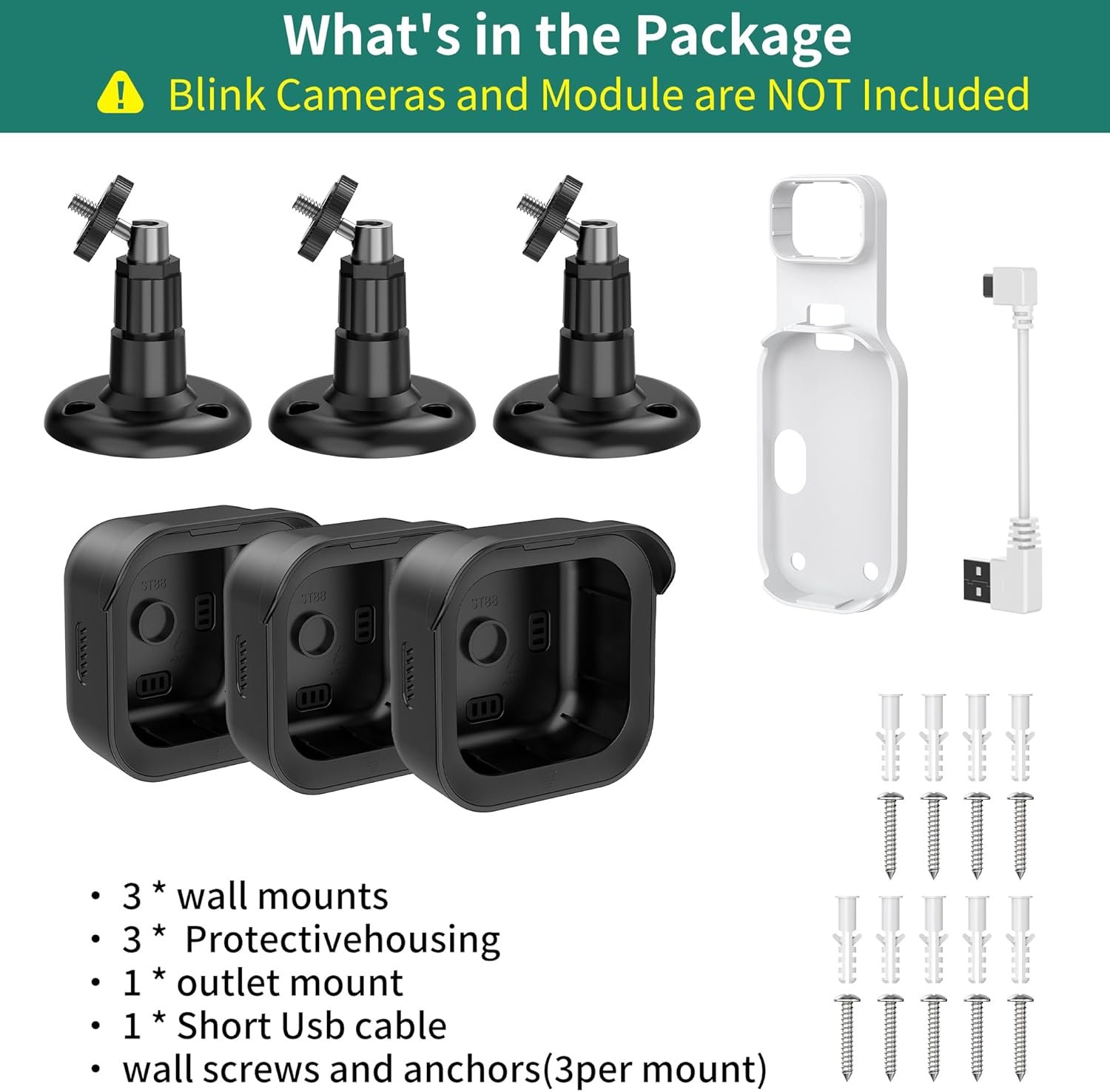 【Complete Installation Kit】Includes 3 camera mounts, 3 protective housings, 1 sync module mount,1 short Usb cable, and wall screws and anchors(3per mount).(not include the camera)