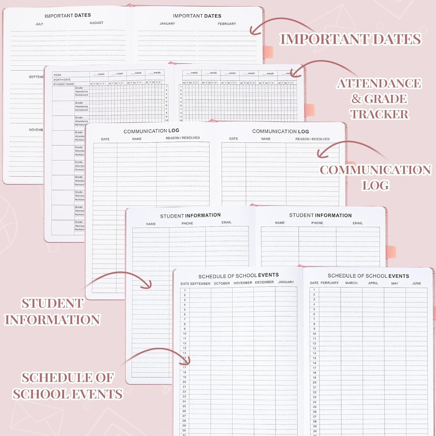 180 pages total, including Important Dates (2)School Events Schedule (2)Student Information (2),Communication Log (2),Student Attendance and Grade Checklist (10),Monthly Calendar (12 months),Weekly Lesson Plans (120), Book Wish List(2) Reading Log(2)