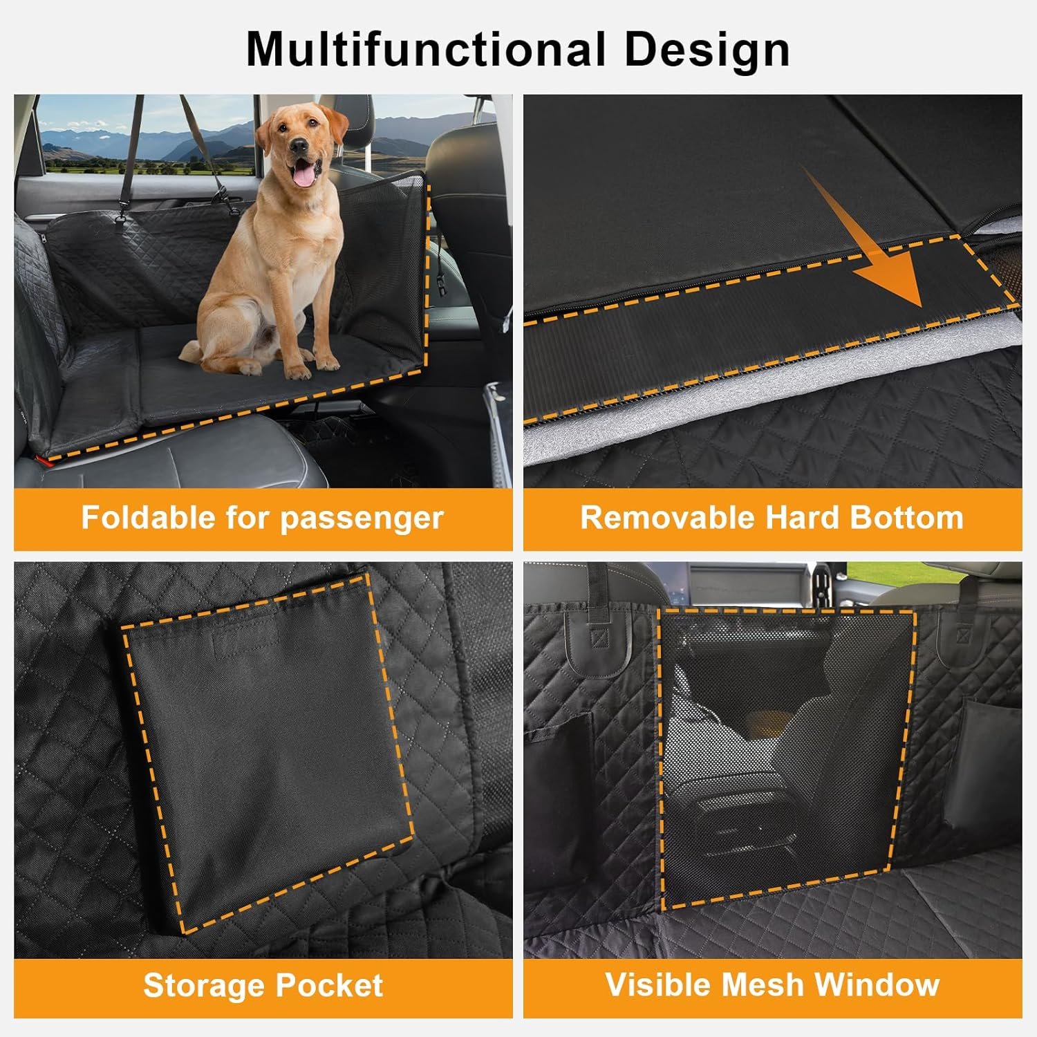 Visible Mesh Window: This dog back seat cover hard bottom features a visible mesh window that enhances airflow and allows easy interaction with your dog. Additionally, it has two large storage pockets, perfect for holding toys, snacks, and other essentials.