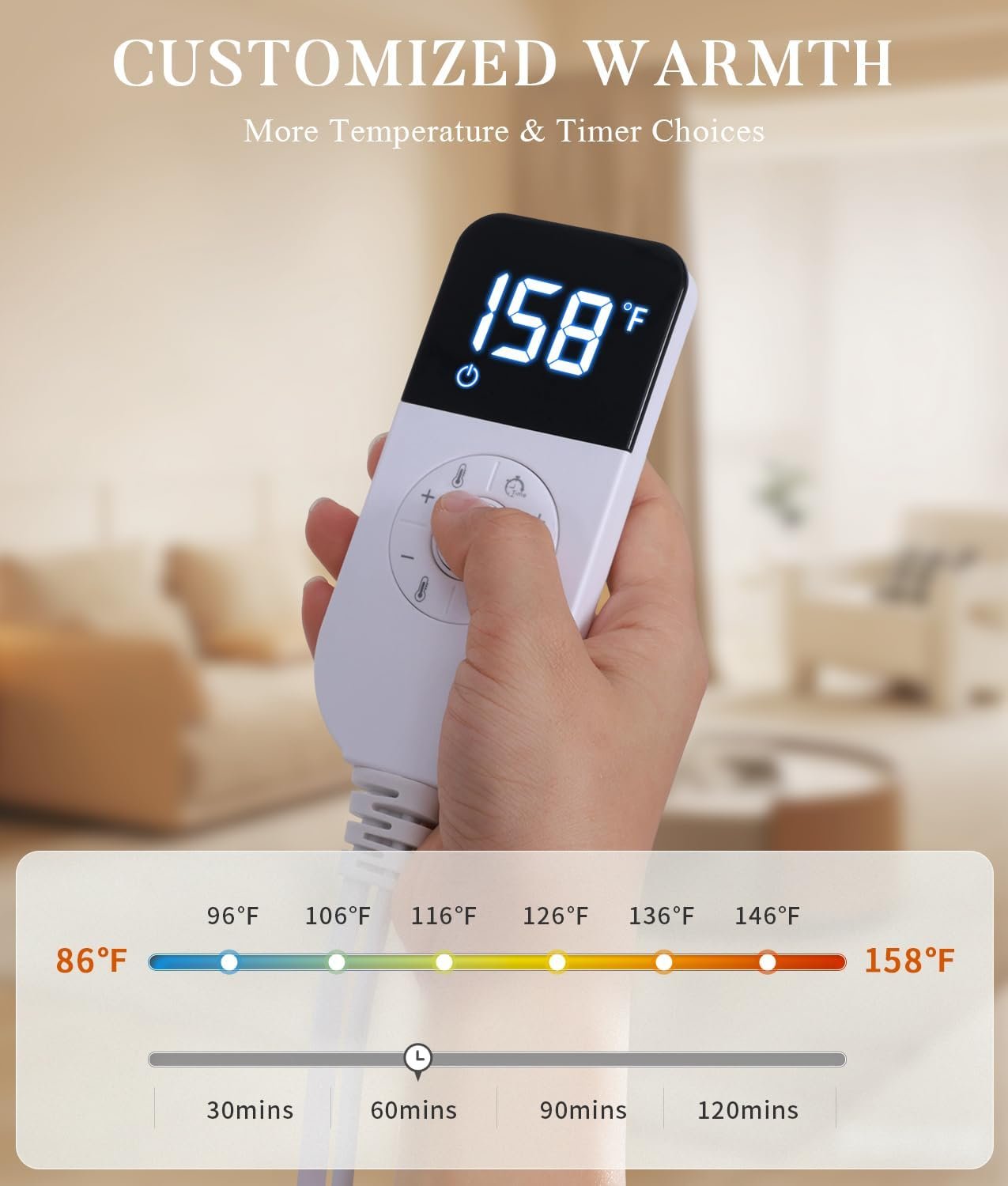 MORE HEAT CHOICES TO CUSTOMIZE RELIEF – To better accommodate your demands, InVarme heat pad features 8 temperature settings(86℉ ~ 158℉) and 2H auto-off timer options. You can easily tailor your preferred warm mode with the LED controller. The hot pad is big enough for most body shapes and sizes.