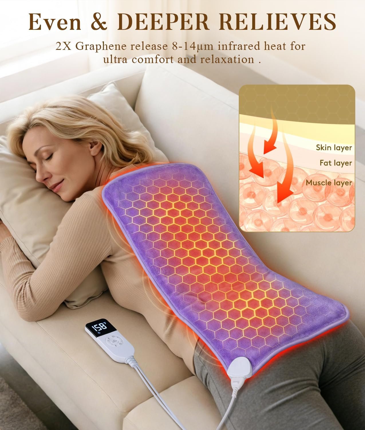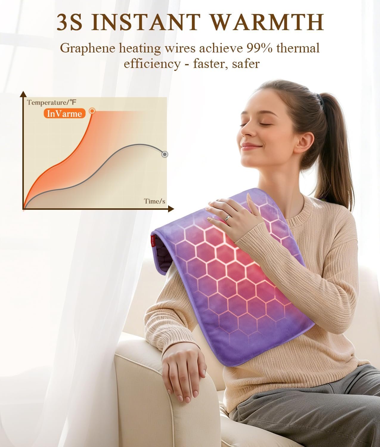 EXTRA HOT FOR DEEPER RELIEF – InVarme Heating Pad is specifically designed to relieve pain efficiently. Benefiting from 2X Graphene infusion, the thermal performance is much higher than others, ensure abundant heat penetration into the body muscle. Get ready to experience a more effective relaxation and take your heat therapy to the next level!