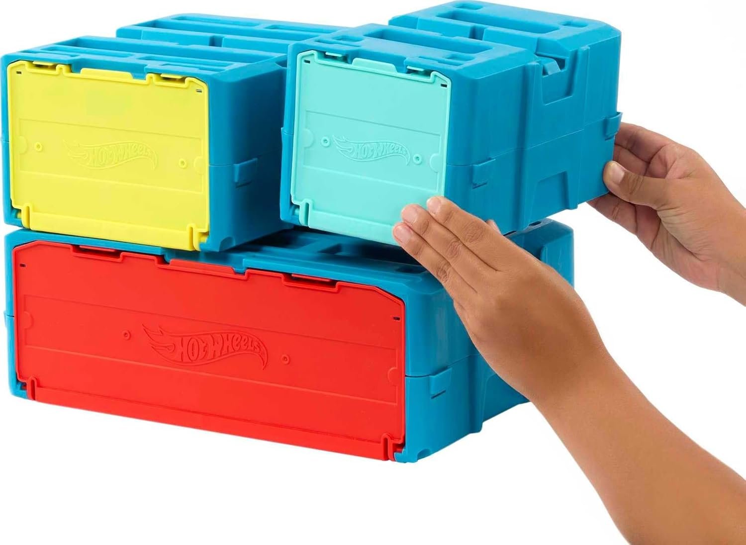 It includes 16 fire-themed track-building pieces and accessories and 1 Hot Wheels car, all of which come in a sleek storage box that can be used to hold the toys between play as well as incorporated into individual builds.