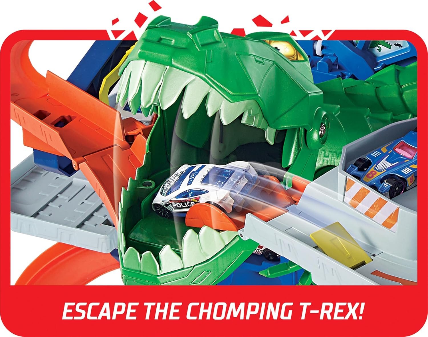 Watch out for the hungry Robo T-Rex looking to devour some tasty Hot Wheels vehicles.