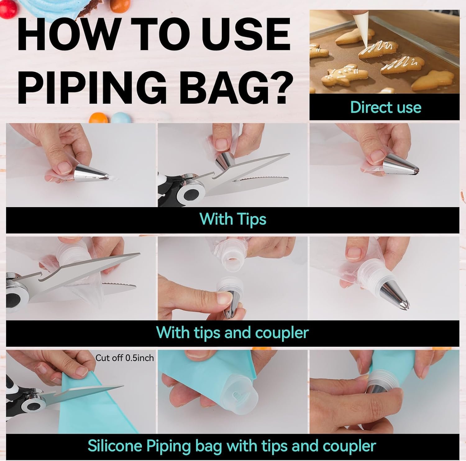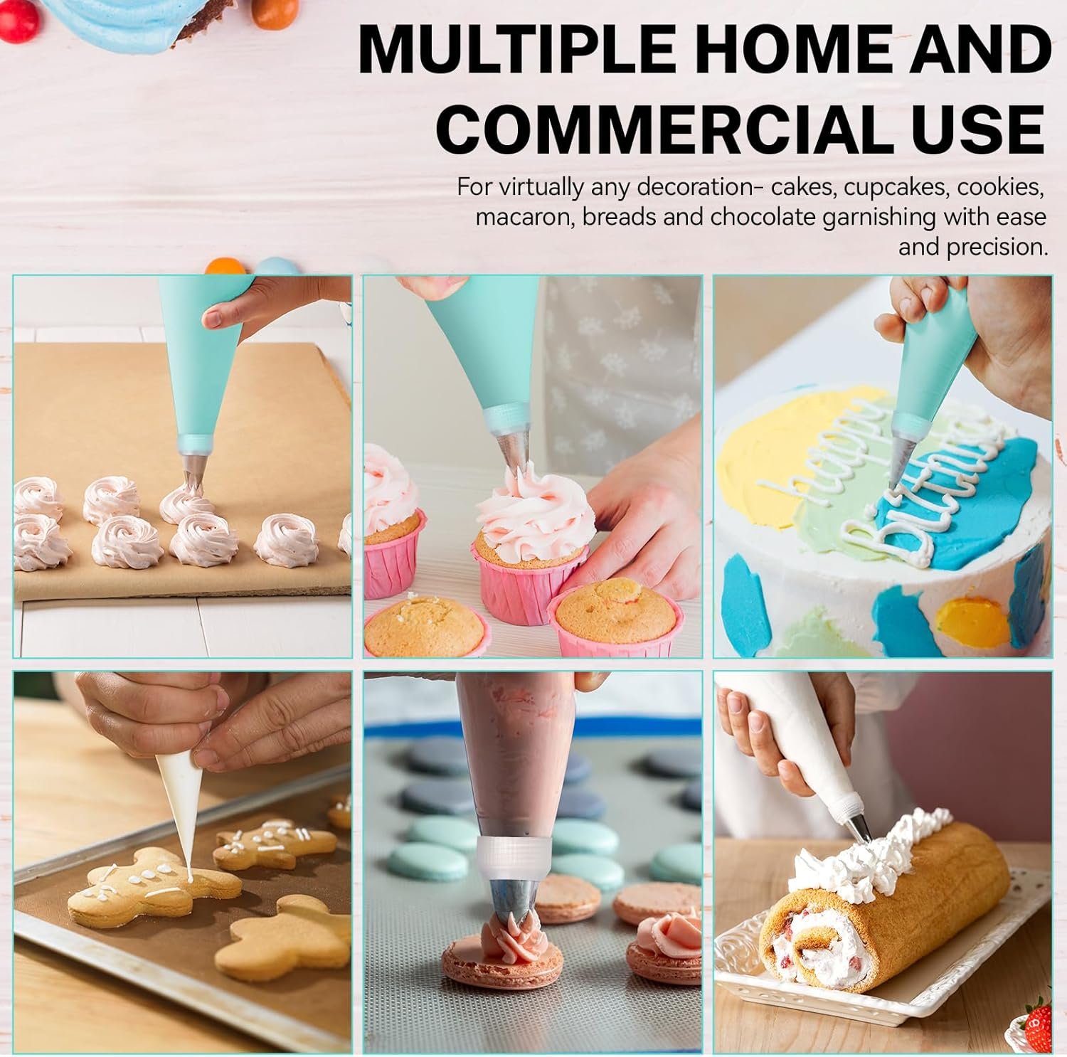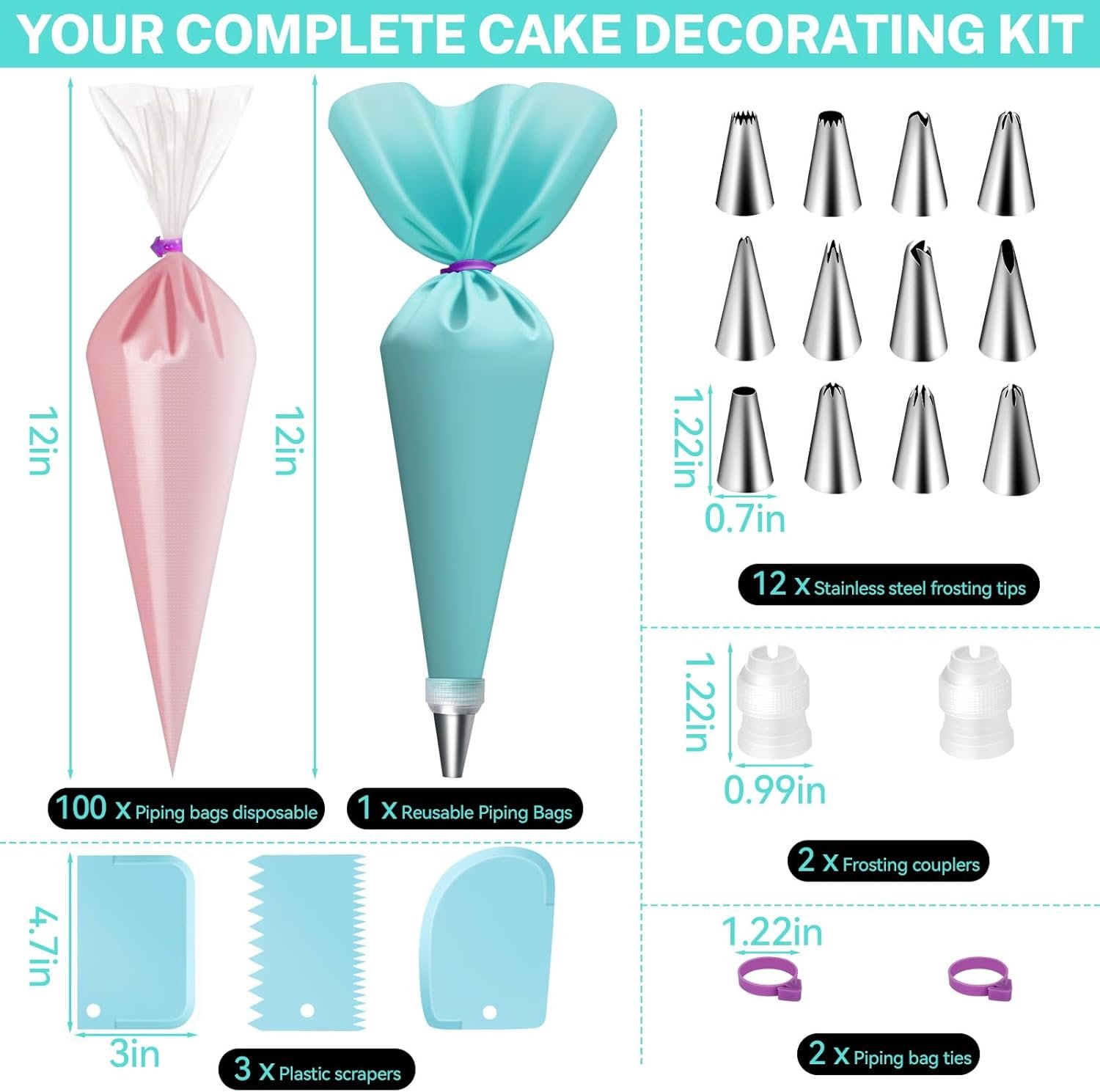 🎂 Complete Cake Decorating Kit – All-Included​: This ultimate ​icing piping kit​ comes with 100 disposable piping bags, 1 reusable silicone piping bag, 12 stainless steel frosting tips, 2 couplers, 2 bag ties, and 3 scrapers. Everything you need to start decorating cakes and cupcakes is in one box.