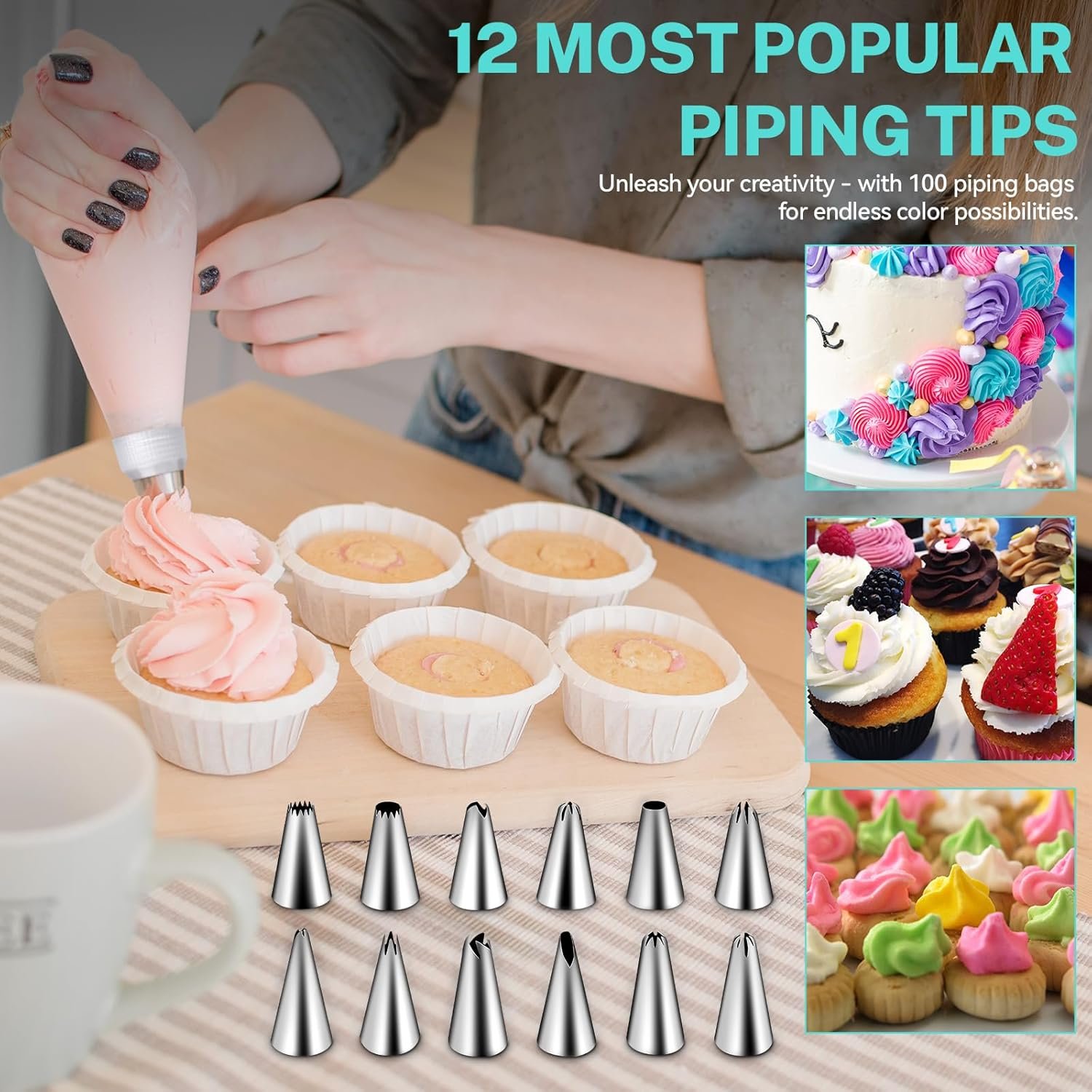 🔄 12 Tips & 100 piping bags for endless shape and color possibilities: With 12pcs most popular piping tips and 100 pastry bags disposable for easy design switching. You can freely create beautiful cupcakes, cake, cookies, and so on.