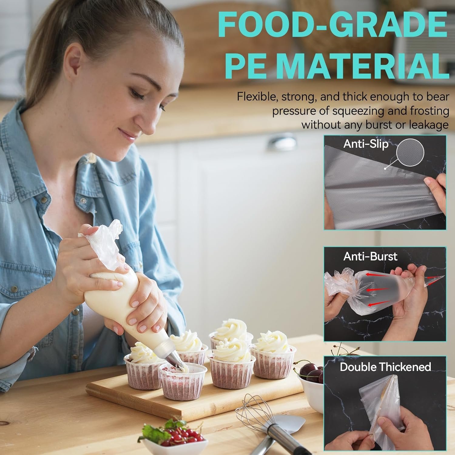 💪 Anti-Burst & Non-Slip Piping Bags​: Our 12-inch ​disposable pastry bag​ are made from Sturdy, Double Thickened PE material. They are designed to resist bursting and slipping, ensuring a clean and comfortable grip for detailed decorating work.