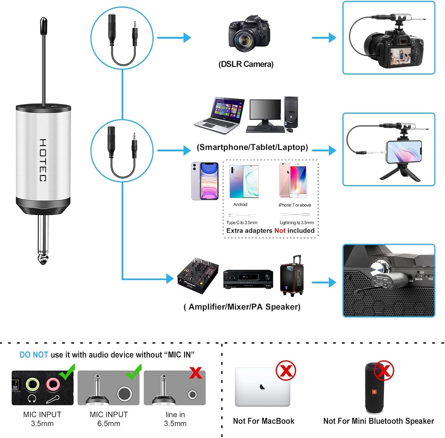 CLEAR SOUND QUALITY: Hotec wireless lavalier microphone systems offers high quality sound transmission and clear voice at operating range up to 240ft line of sight without feedback or distortion.