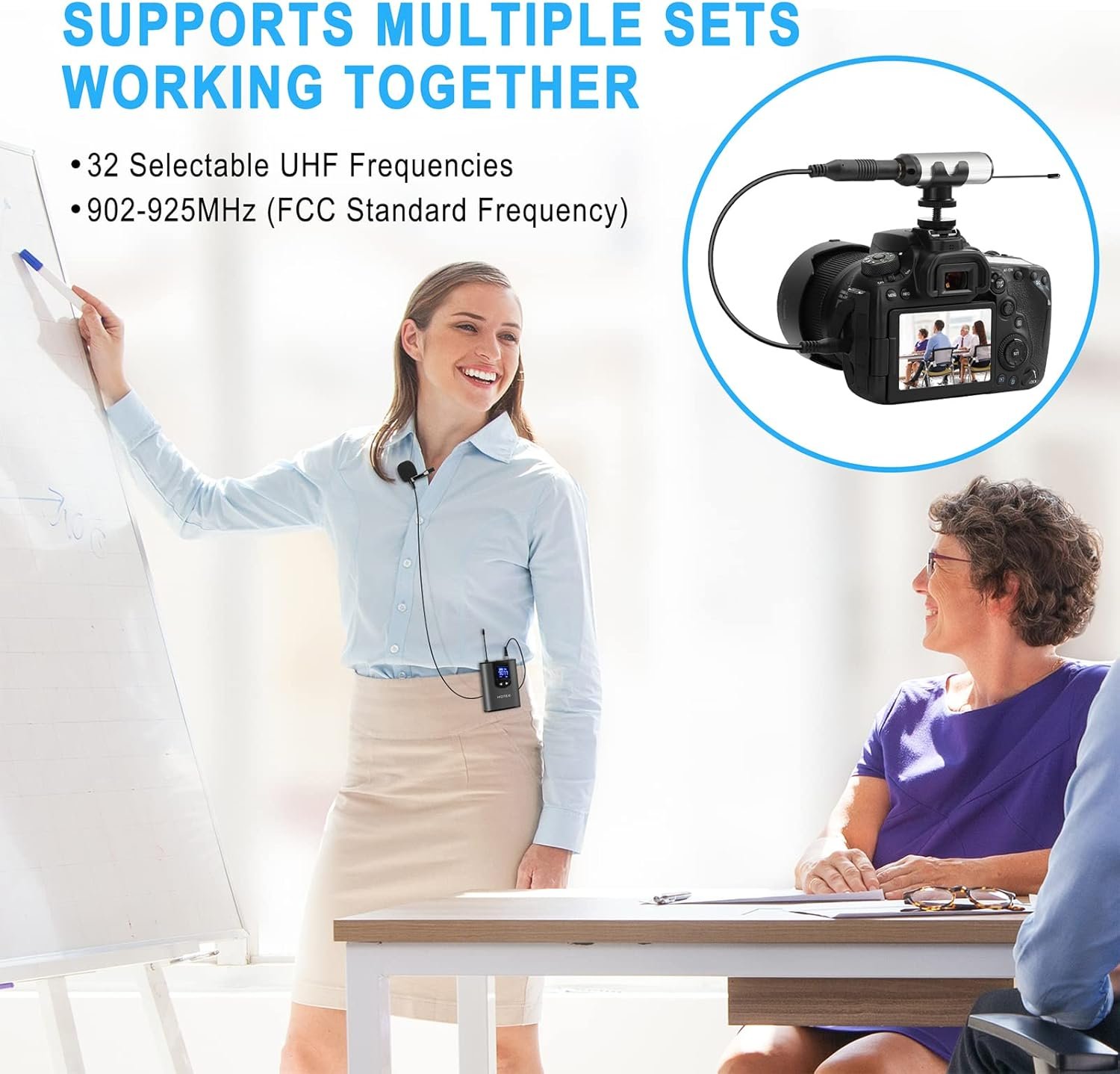 The working frequency is from 902 to 915MHz and complies with the new FCC regulations for wireless microphone. This UHF technology also allows you to use several sets together without interfere with each other, great for interviews or small groups. Spend a few minutes to select the most appropriate frequency before using them.