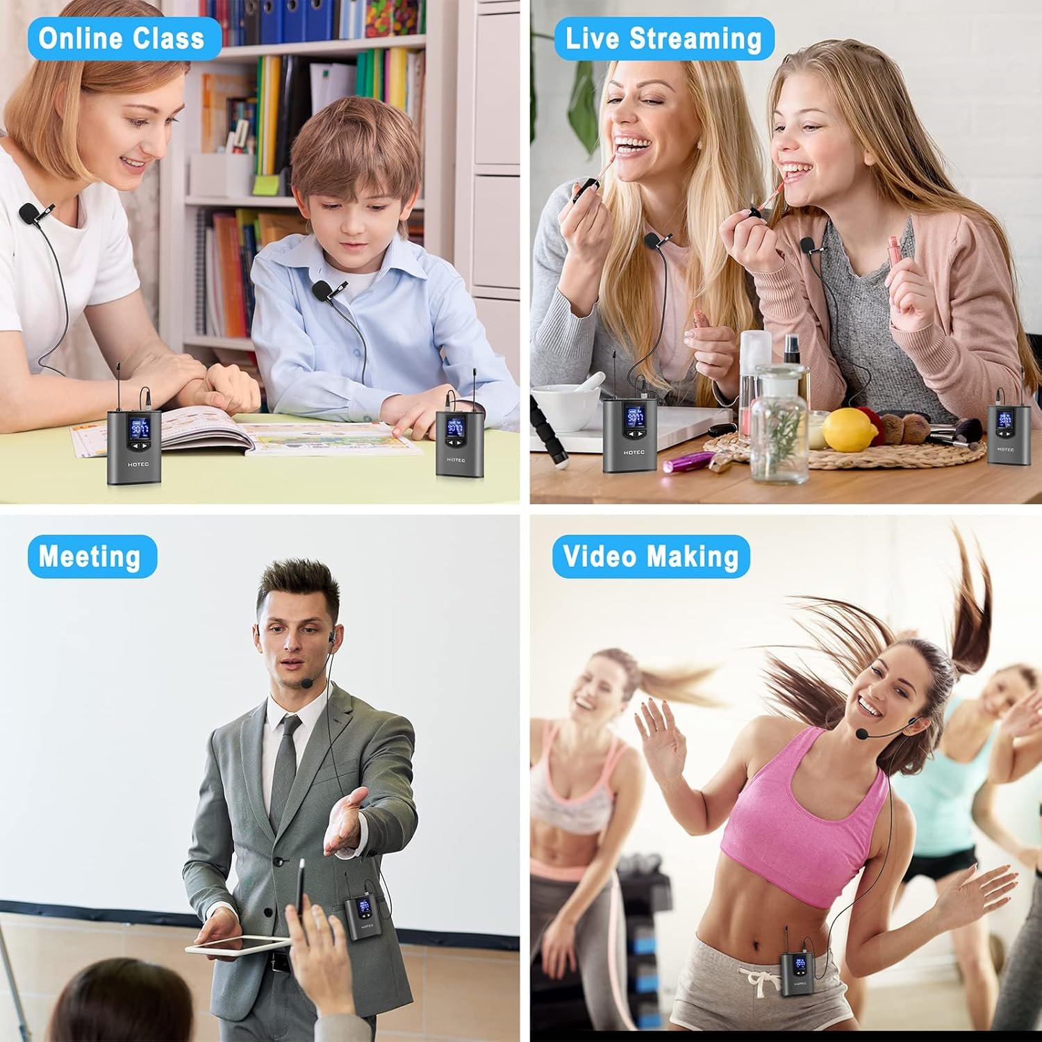 Hotec Wireless Headset/Lapel Microphone comes with a portable receiver, a Bodypack transmitter, a headset microphone and a lapel microphone. It is perfect for students, people starting out on YouTube, or other live events. This professional UHF Wireless Headset/Lapel Microphone System provides clear and warm vocal sound.