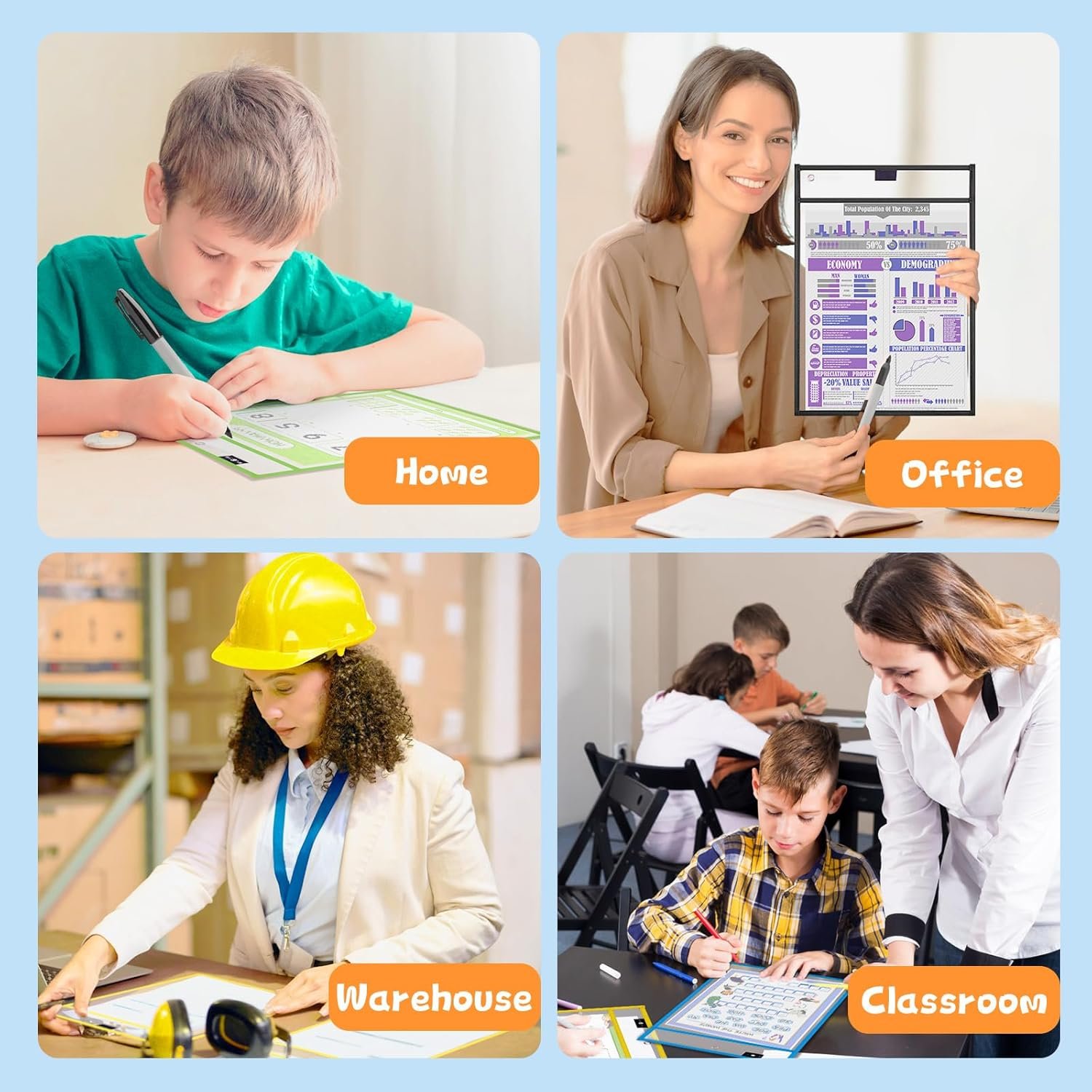MULTI-SCENARIO APPLICATION. Great choice for students and teachers looking to maximize the utility of paper worksheets, classroom must haves! Perfect for back-to-school, art centers, homeschooling, elementary, kindergarten, etc. The pocket protector is also helpful in the office, shop, warehouse, and restaurants, you can use the waterproof and damage-resistant dry erase pockets to store documents and shop tickets or reuse the daily plan list, datasheets and more