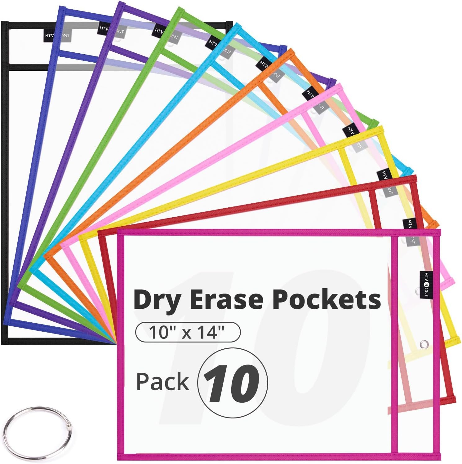 OVERSIZED DESIGN FOR MULTI-USE. Set comes with 10pcs of plastic dry erase pocket sleeves in assorted colors and a metal binder ring. Our clear dry erase pockets measure 10 x 14inches for neat insertion and removal of most standard paper like letter-sized and A4 paper sheets, which fits most of the student activity sheets, schedule lists, work files, job ticket orders, etc