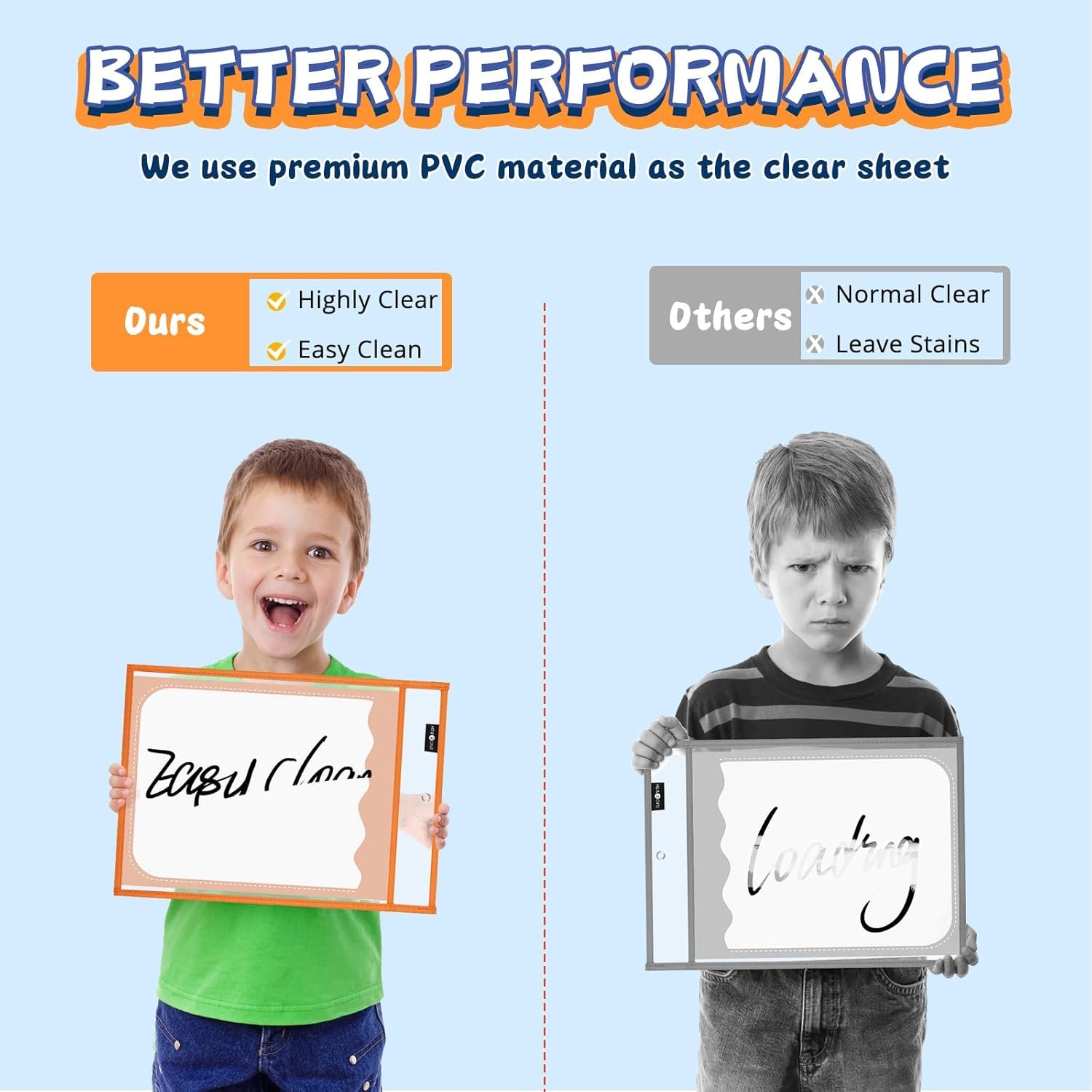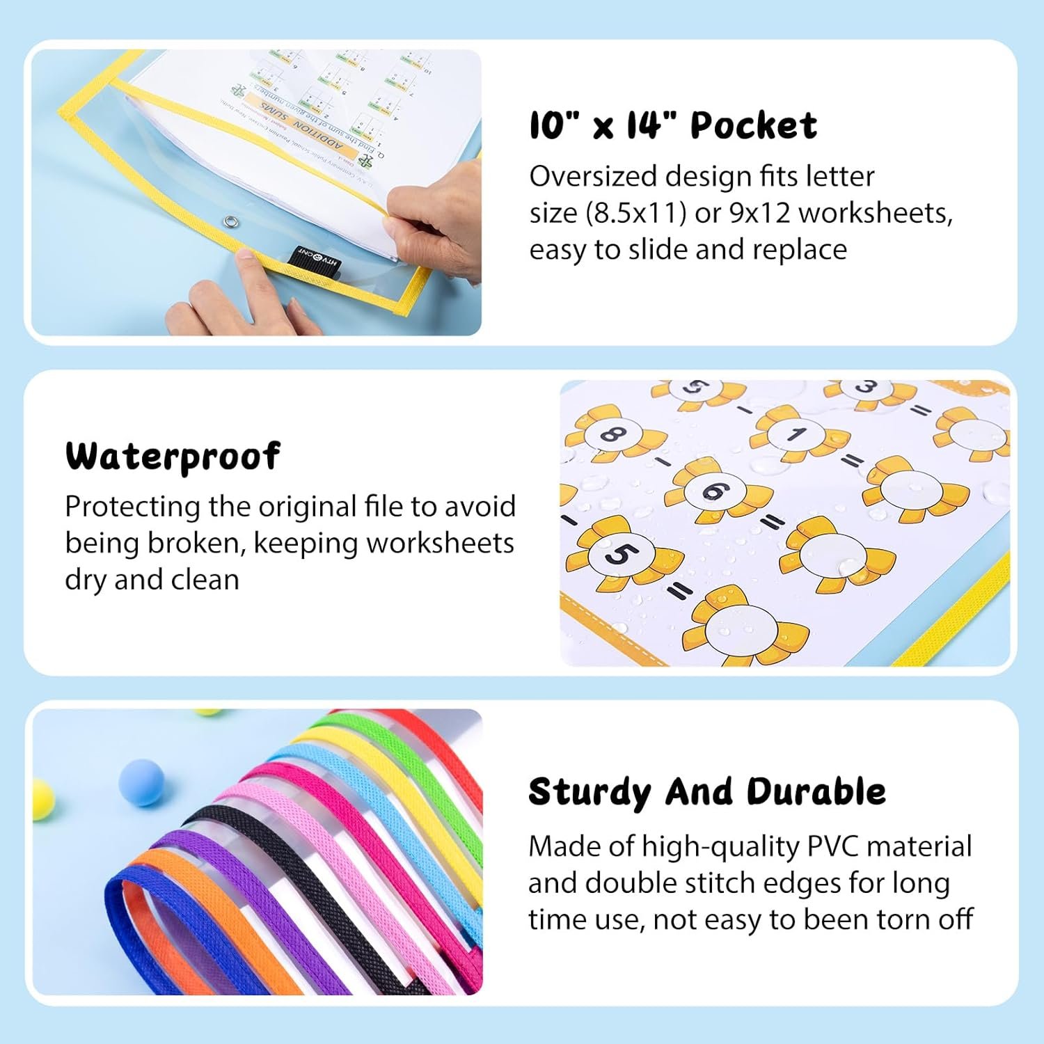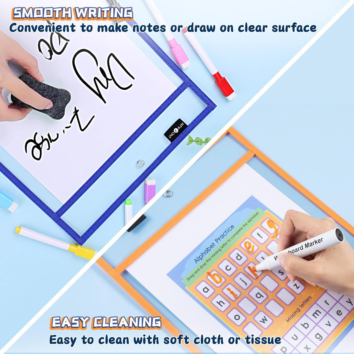 QUALITY WORKMANSHIP AND DURABLE. HTVRONT clear dry erase pocket sleeves are made of premium PVC plastic and the non-woven border with industrial-grade double stitching according to the highest quality standard, solid construction and resist rip. The heavy-duty cloth binding makes our dry erase pockets hold up to the wear and tear of the naughty kids for full school year use, student and teacher must haves in the classroom