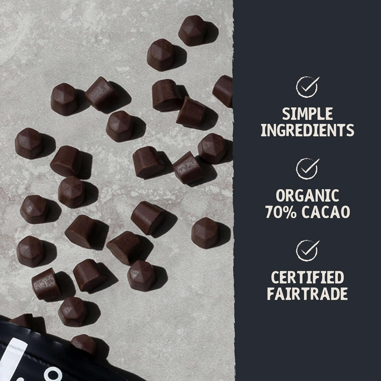 DELICIOUS CHOCOLATE CHIPS: Meet the new chocolate chip on the block. Our version of this baking staple features a cool hexagonal shape that will instantly upgrade your cookies/brownies/etc….if you can stop snacking long enough to bake with them. Hu Gems have a rich cocoa flavor punctuated by subtle caramel notes, making them solid (dare we say addictive?) choice for both snacking AND baking.
