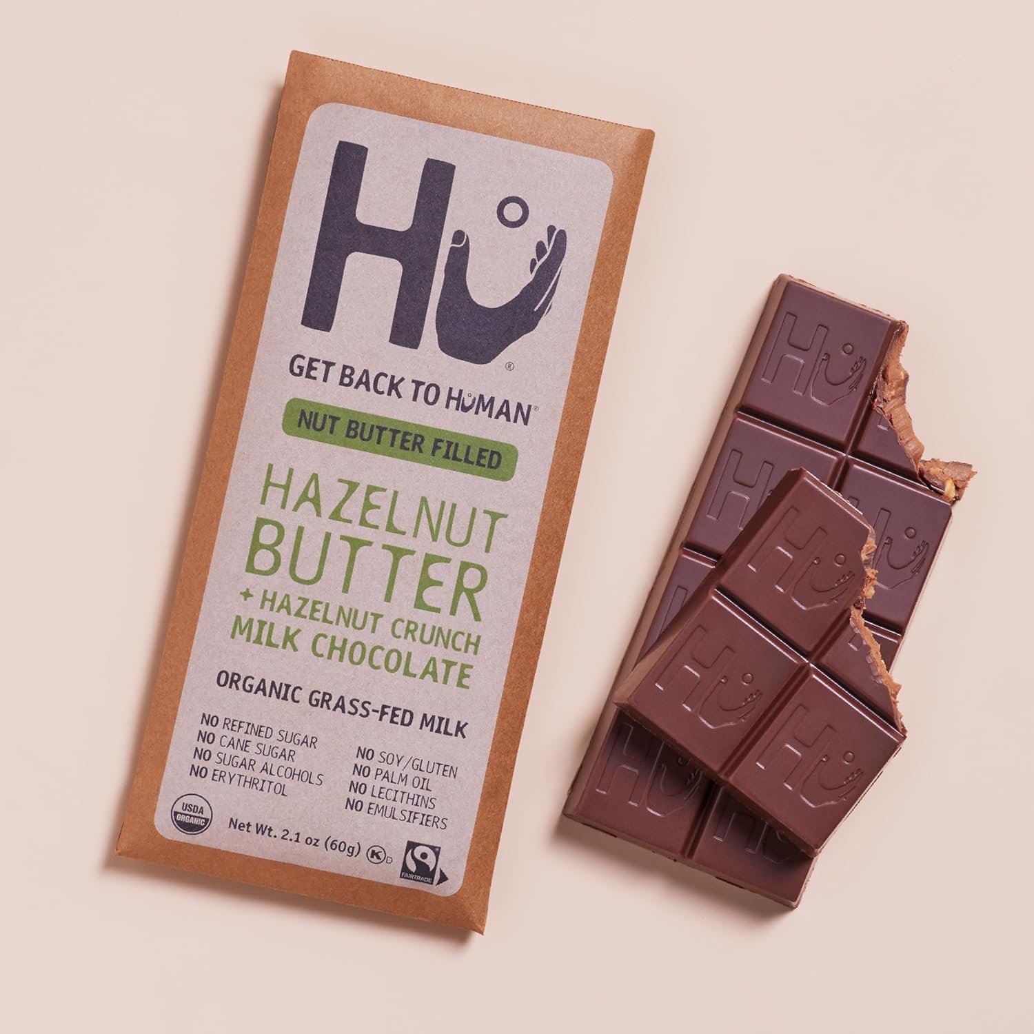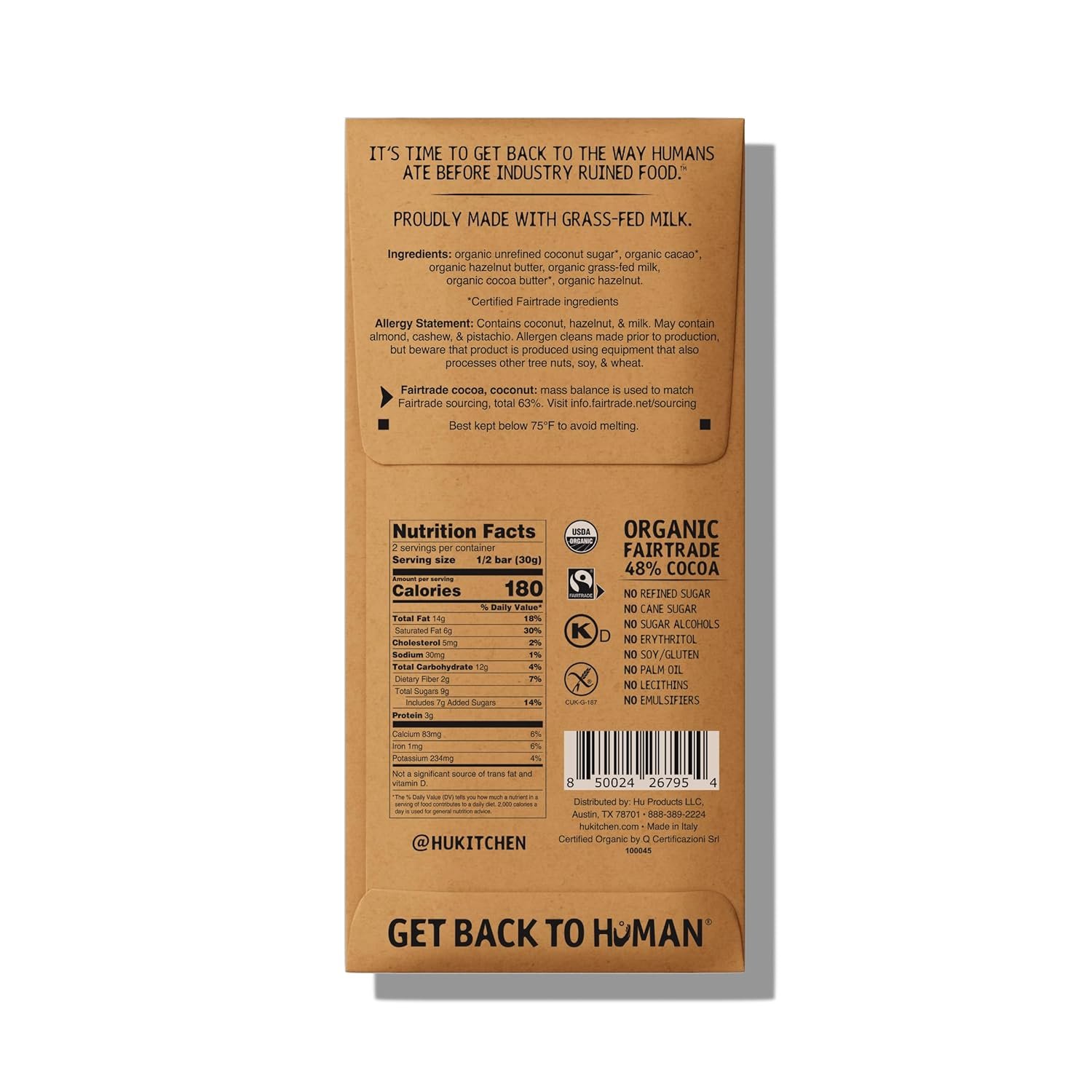 Hu Milk Chocolate Hazelnut Bar, Organic, 2.1 oz. Everyone’s favorite hazelnut chocolate spread – made the Hu way. Our most indulgent bar ever with an ingredient list so simple, you’ll be looking for the other half of the wrapper. We couldn’t find delicious milk chocolate that fit our specs, so we made our own