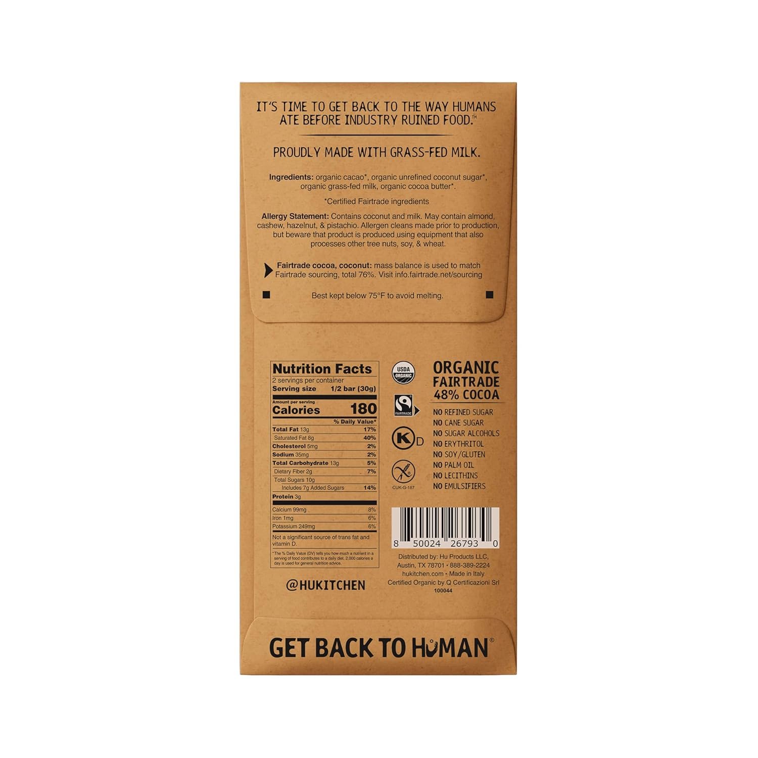 Hu was founded to unite simple ingredients with unbeatable taste. We couldn’t find a chocolate that met our standards, so we created our own. With no refined/cane sugar, no sugar alcohols, no soy/gluten, no palm oil, and no lecithins, indulge in chocolate that tastes just as good as it makes you feel. Go ahead, get back to Human.