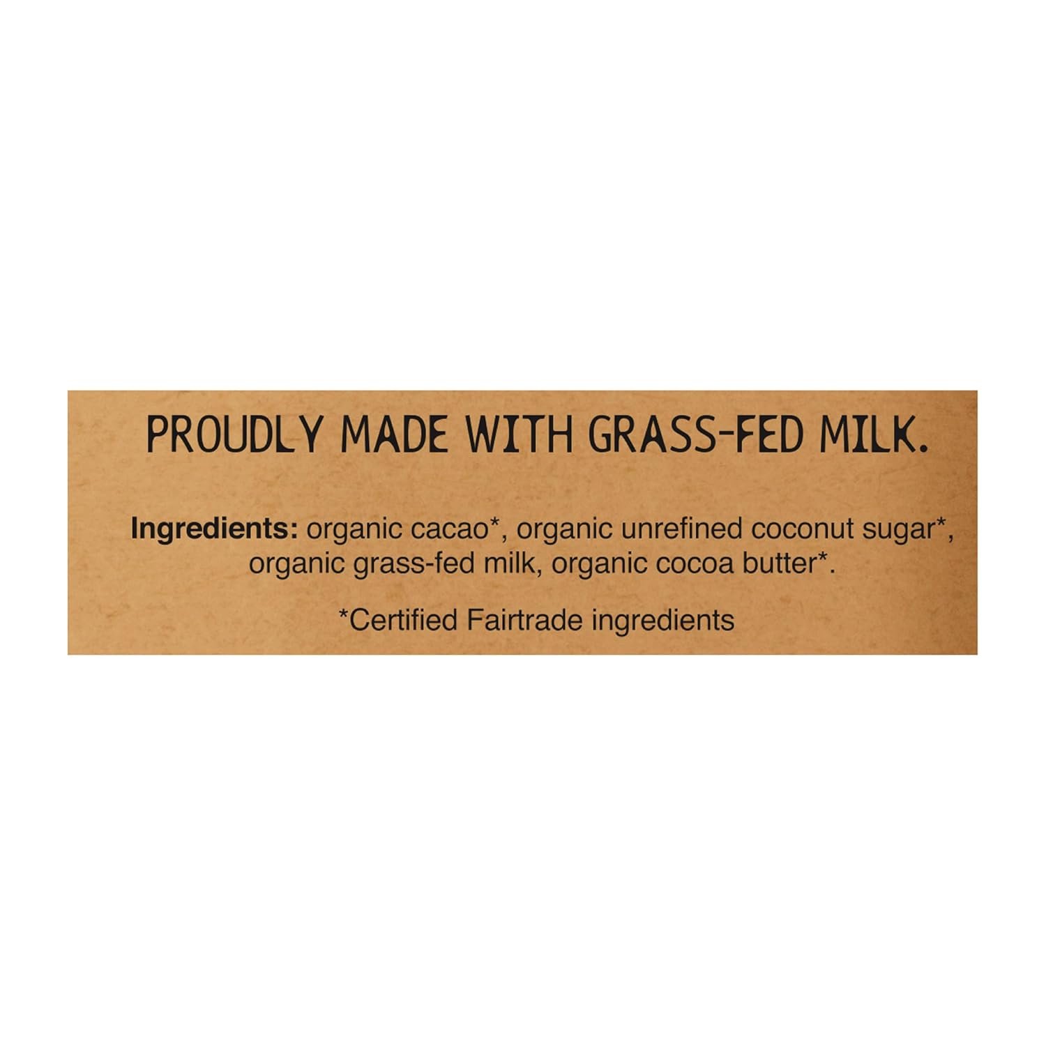 SIMPLE INGREDIENTS: Made with cacao, unrefined coconut sugar, cocoa butter – all Organic and Fairtrade, plus organic grass-fed milk