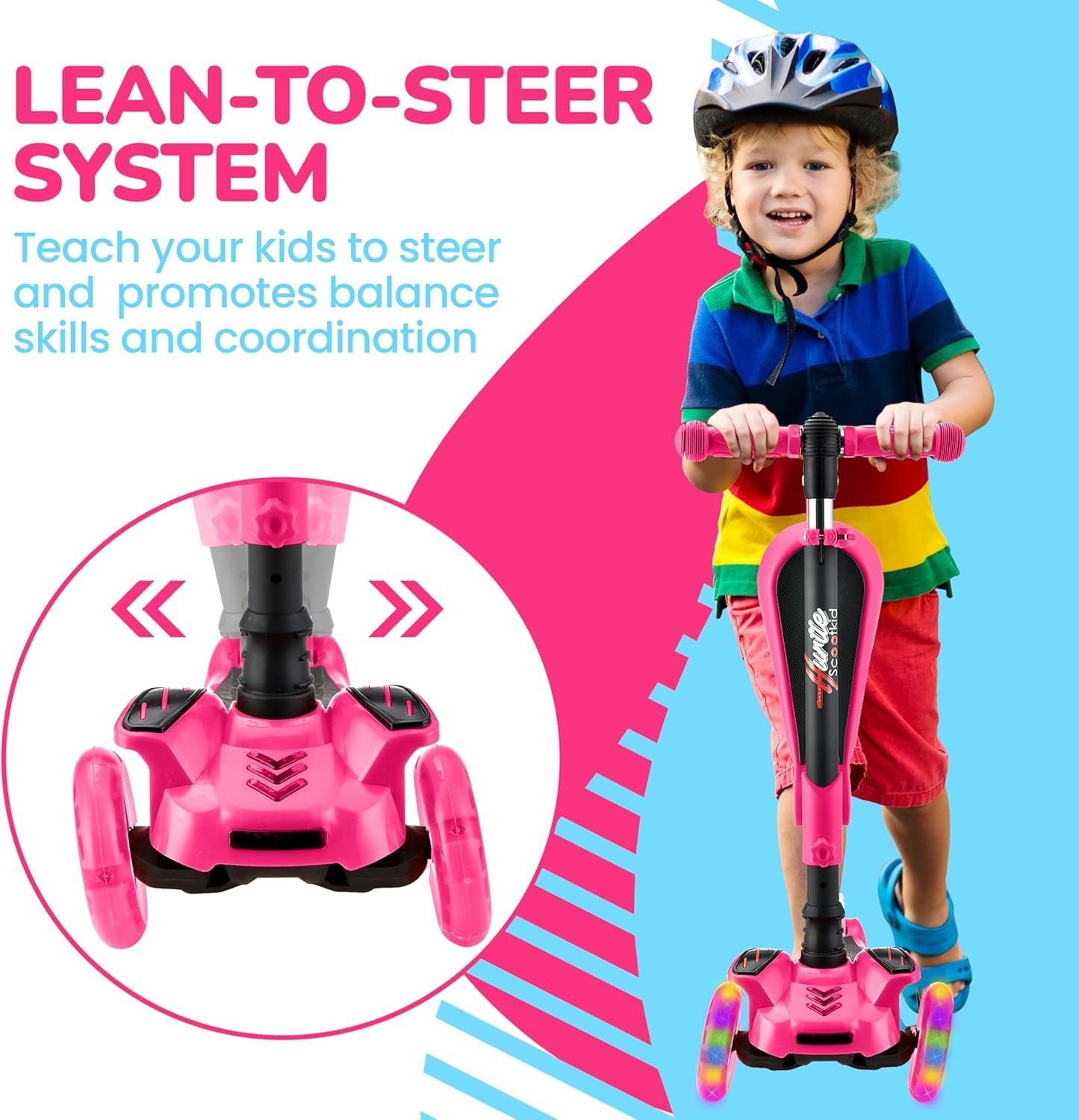 LEAN-TO-STEER TECHNOLOGY: Features easy maneuvering w/ lean-to-steer technology, which means the mini scooter is controlled by leaning rather than turning the steering wheel, this design helps your child develop balance skills, coordination and more