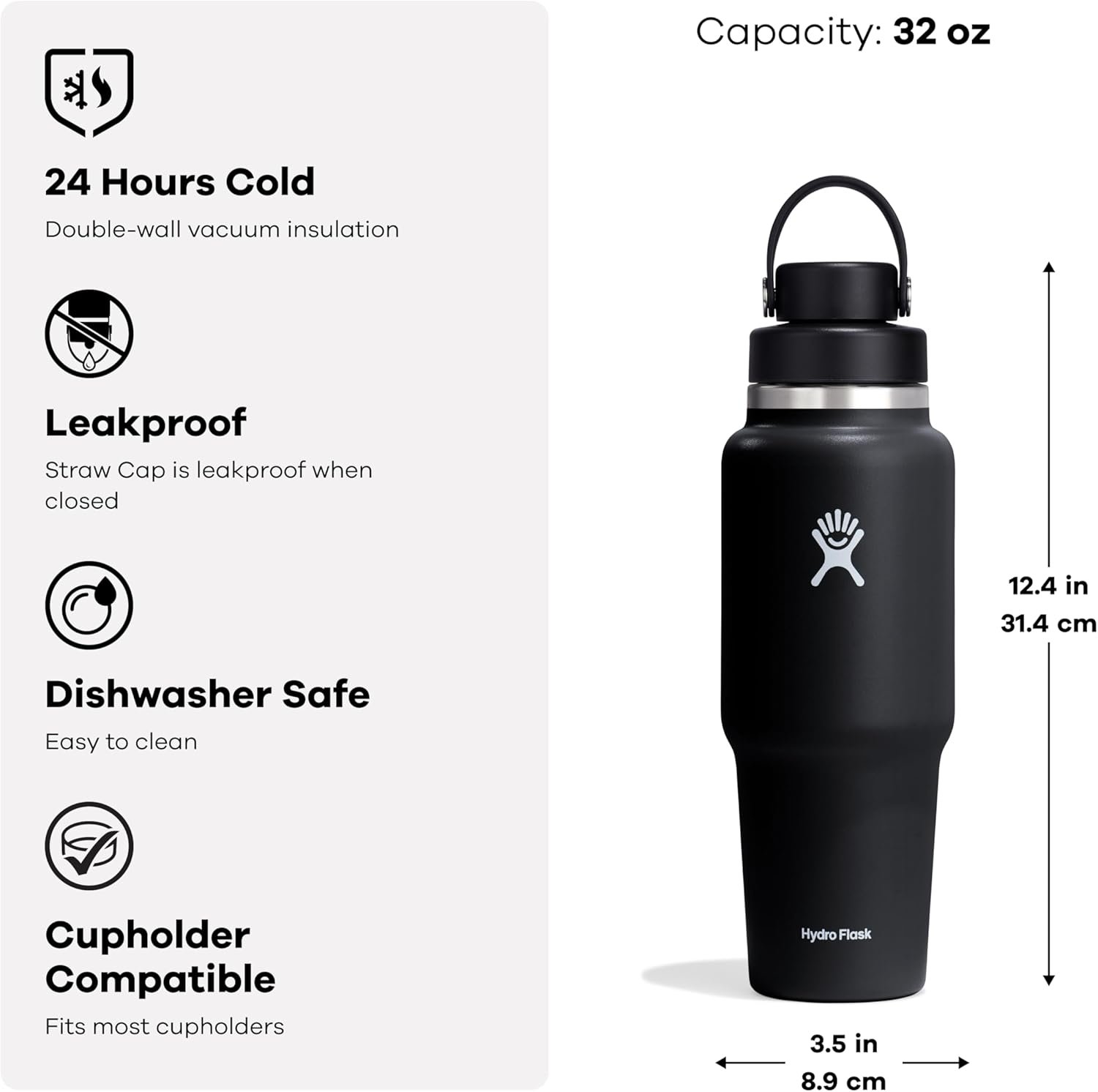 The Travel Bottle is the best of both worlds—leakproof, 24 hours cold and cupholder compatible. Your favorite insulated 32 oz Hydro Flask bottle, now with a cupholder-fit design. Drinks stay cold for 24 hours, and the Chug Cap makes it easy to stay hydrated. The insulated bottle easily fits ice cubes and is dishwasher safe. Designed for seamless cupholder fit, it’s right at home on the open road.