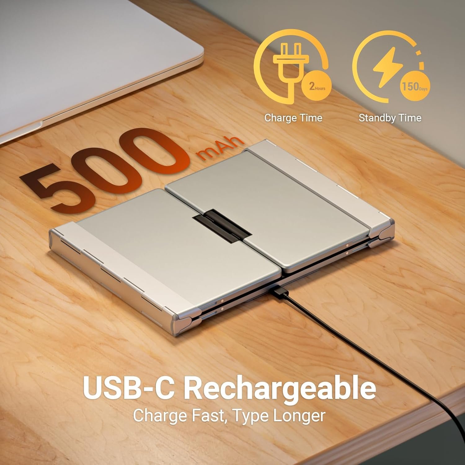 USB-C Rechargeable – The foldable Bluetooth keyboard has a built-in rechargeable battery, a full charge lasts up to 5 months with usage of 2 hours daily without backlit. When the backlight is used, the power stays on for up to 5 hours. Ensuring the keyboard remains ready for use when you need it.