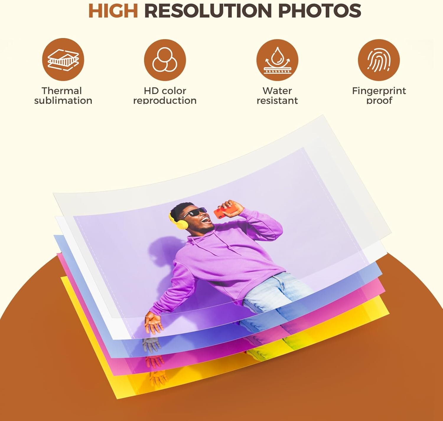 👍[4×6 photo printer high-definition printing]This small photo printer adopts thermal sublimation technology, no need for ink, 300dpi resolution to achieve a smooth transition of color, high color reproduction. Each photo will be automatically covered with a transparent film after printing, can do dustproof, waterproof, oil-proof, fingerprint-proof, photo prints can be preserved for a long time without fading, so that your photos are perfectly presented