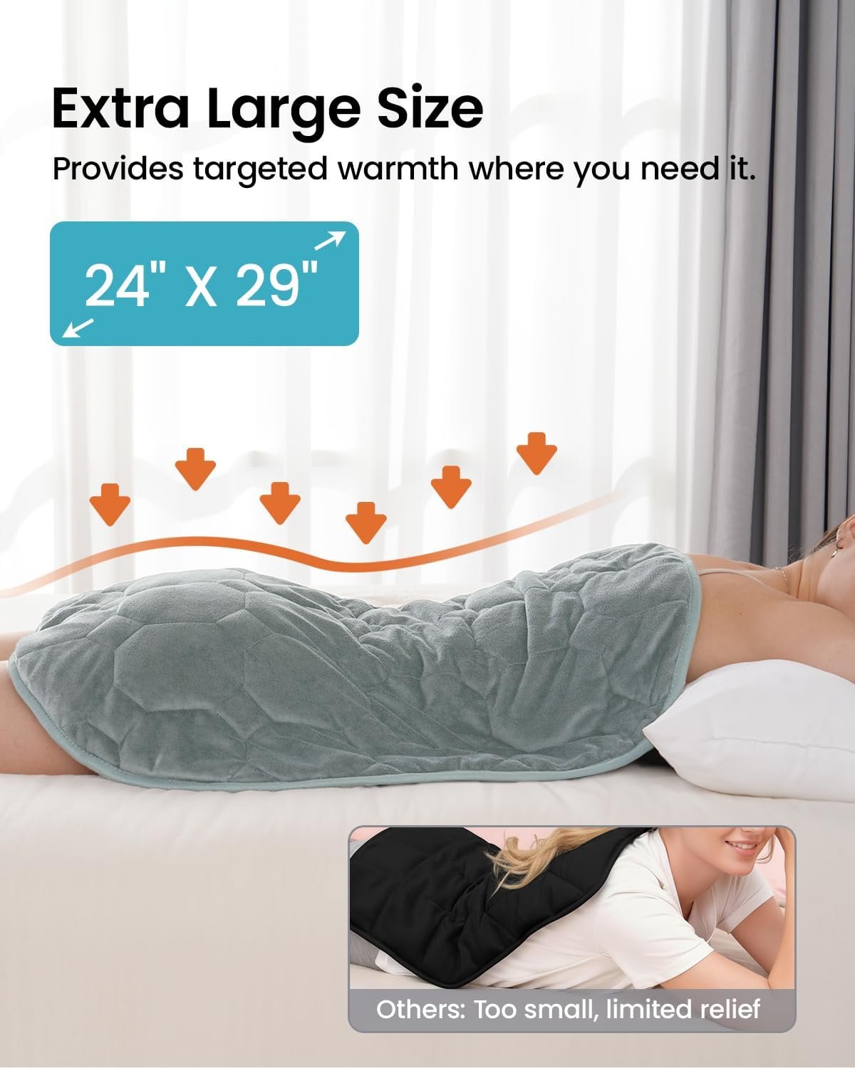 29*24 Inches Perfectly Covering: We have increased the size to perfectly cover your back, abdomen, lap, neck, and shoulder. With this larger coverage, you’ll experience additional warmth around your waist, making spasms more manageable