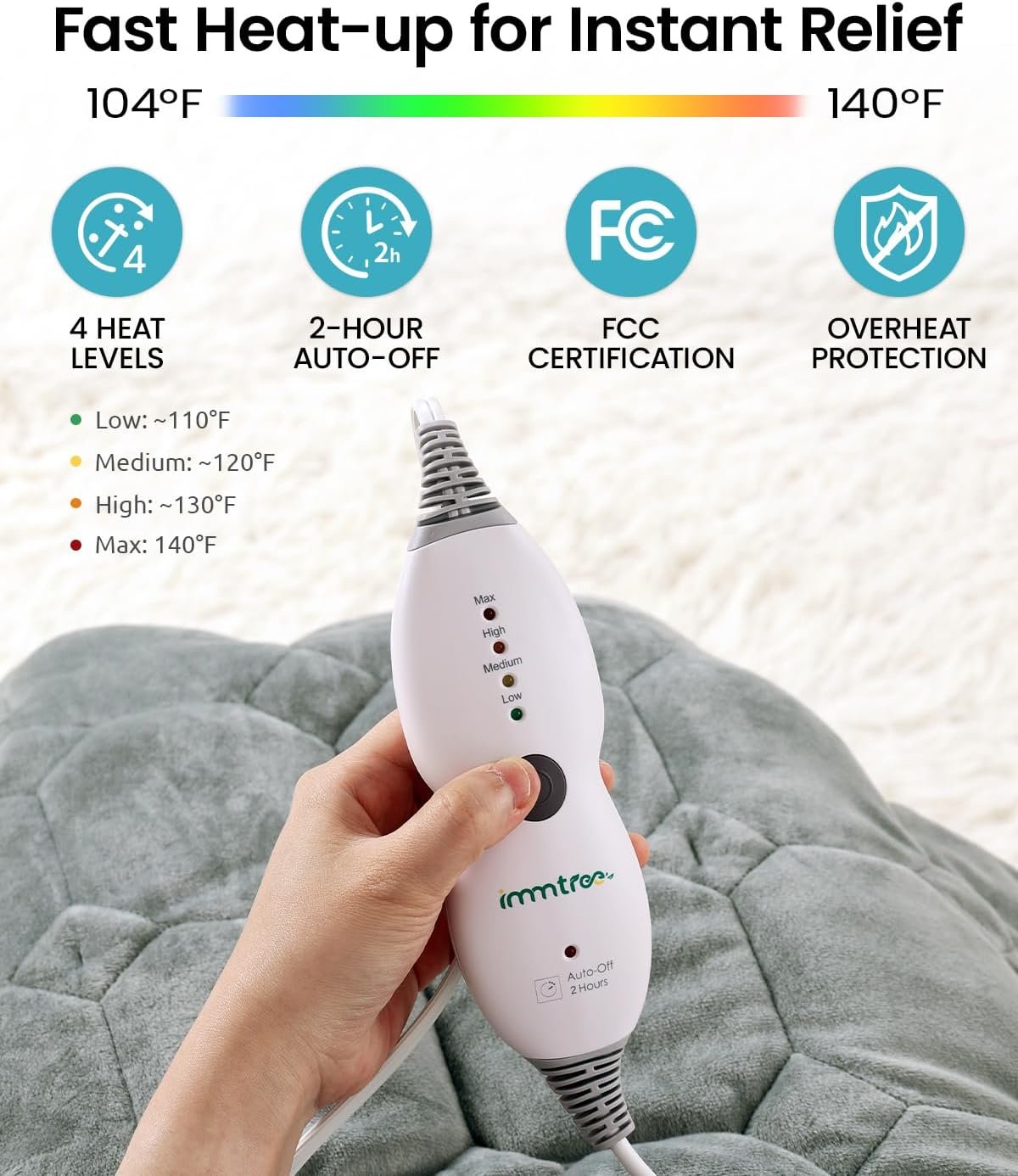 V2.0 Smart Upgrade: Customize your warmth with just one touch. Switch between 4 heat levels—Low (~109°F/43°C), Medium (~120°F/49°C), High (~129°F/54°C), or Max (~140°F/60°C). With a 2-hour auto shut-off, you can set it and relax with peace of mind