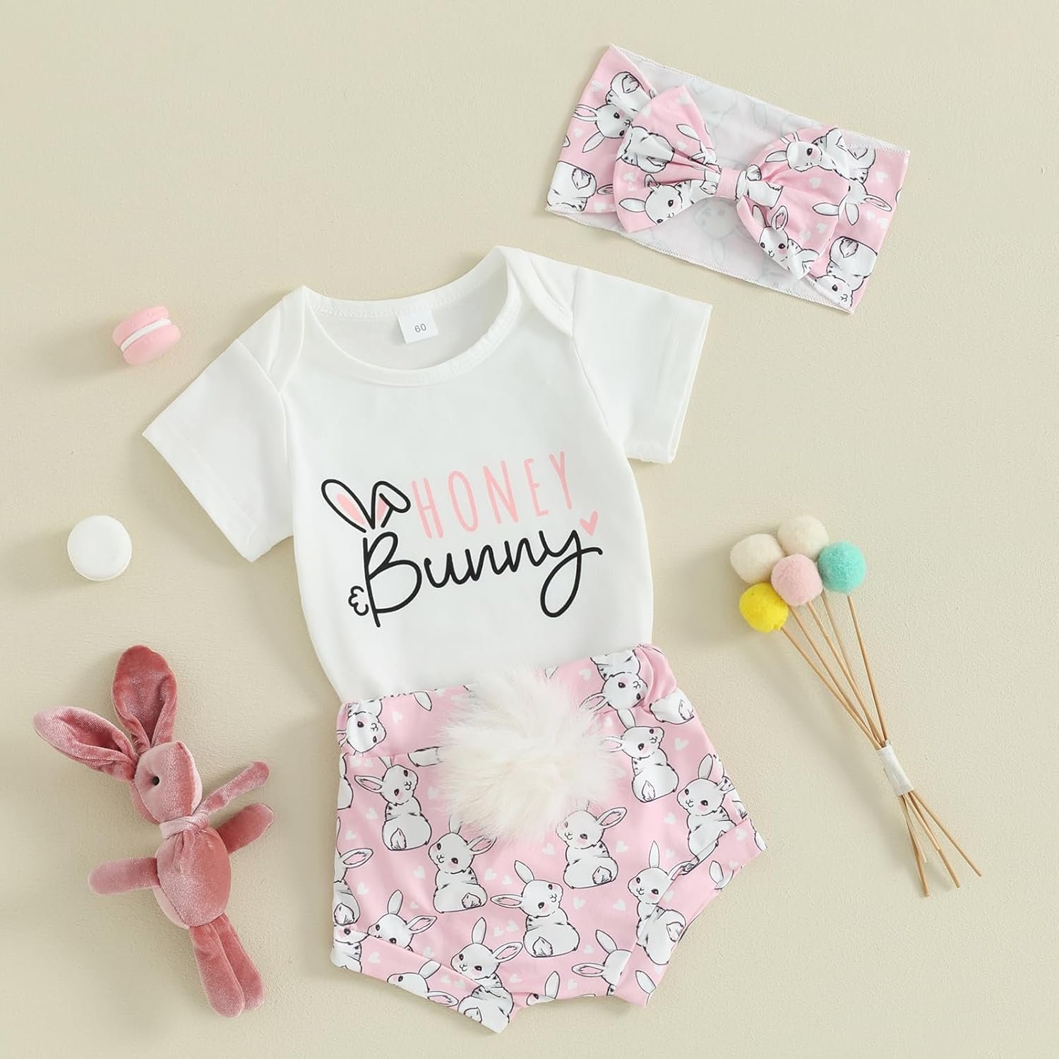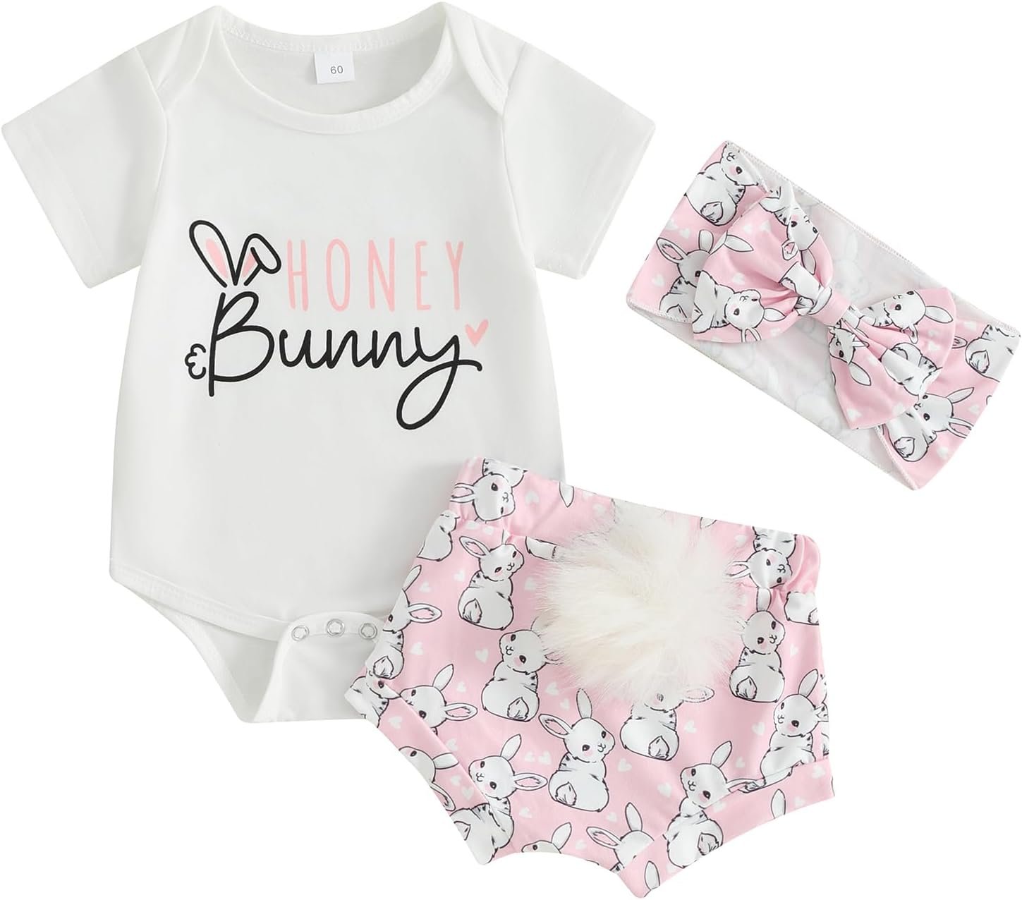 Baby Girl Easter Outfits Rabbit Ears/Letter Print Crew Neck Short Sleeve Romper Shorts Headband 3Pcs Clothes Set
