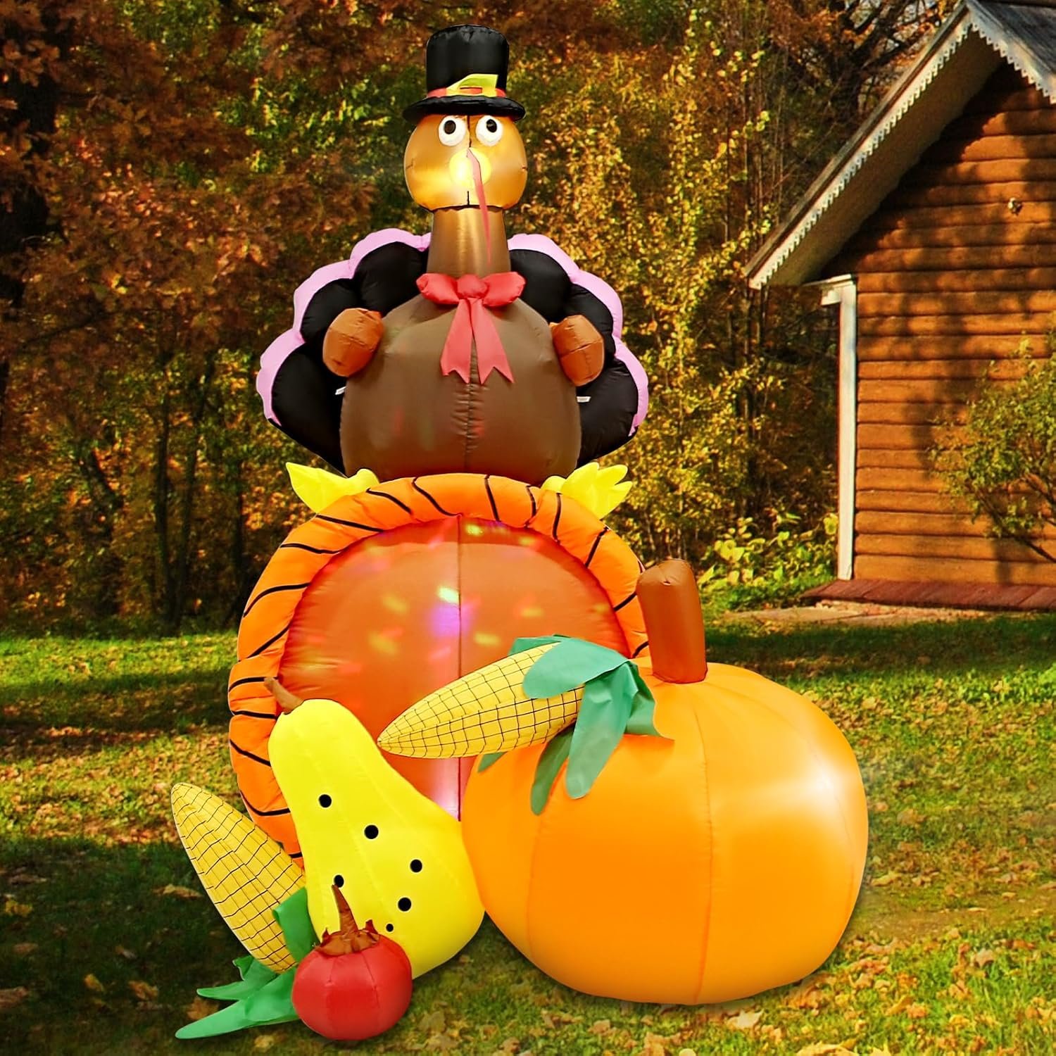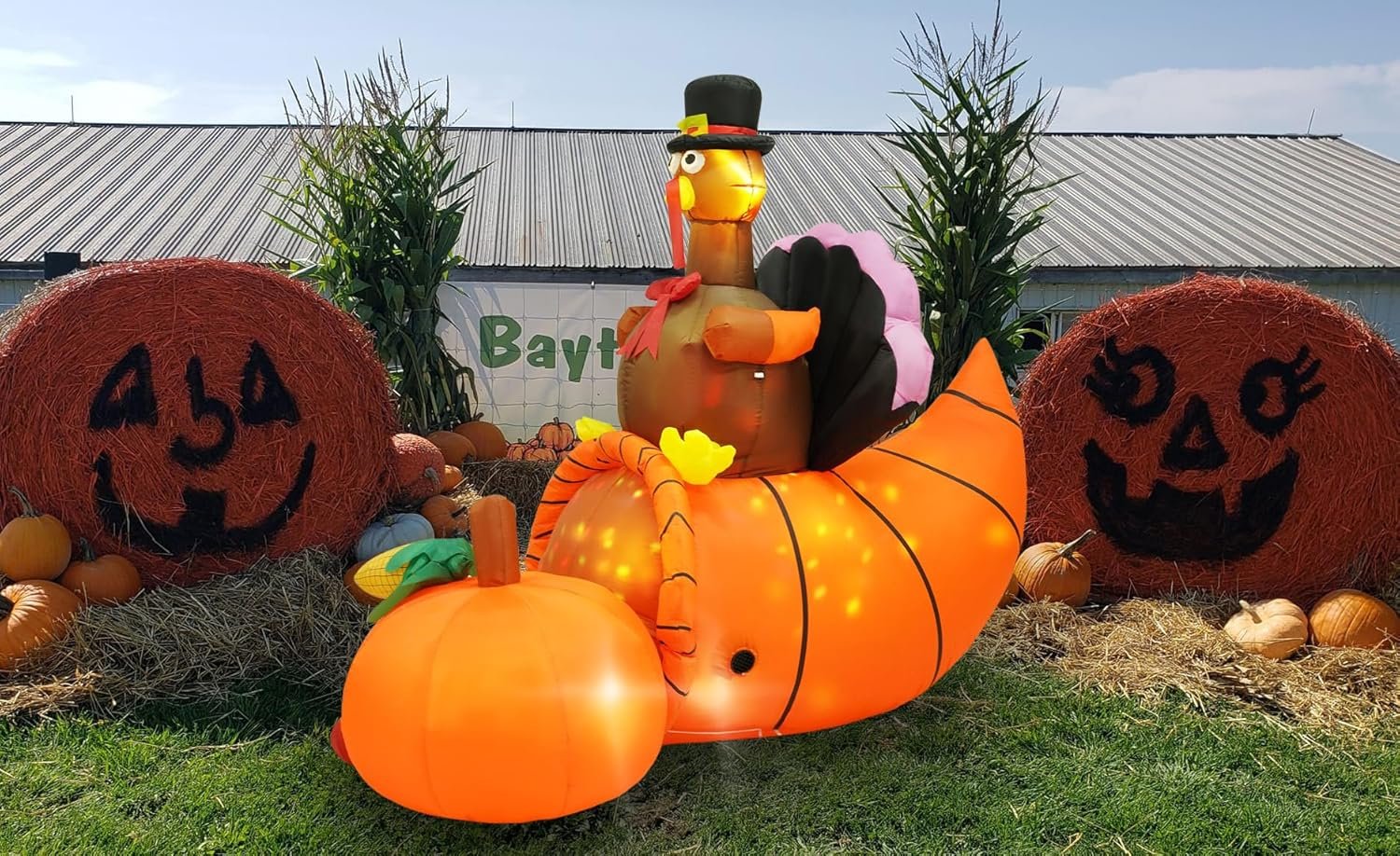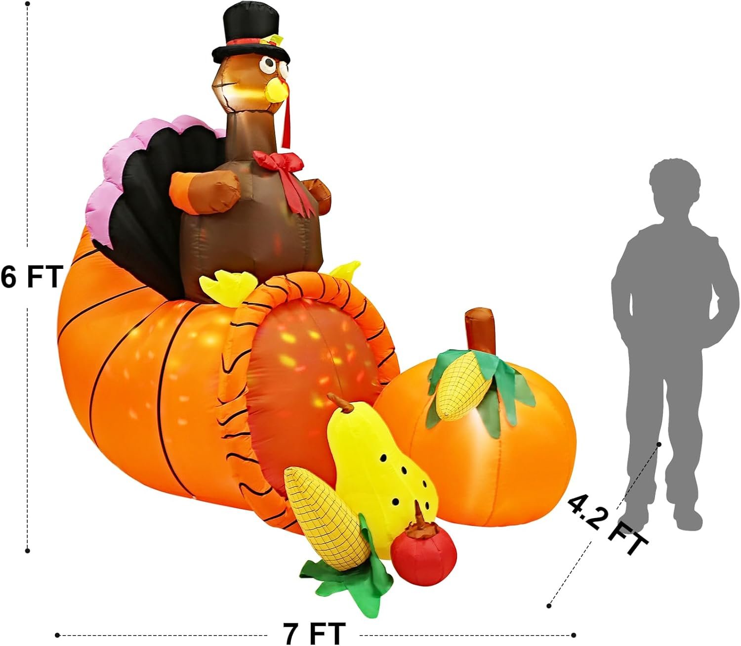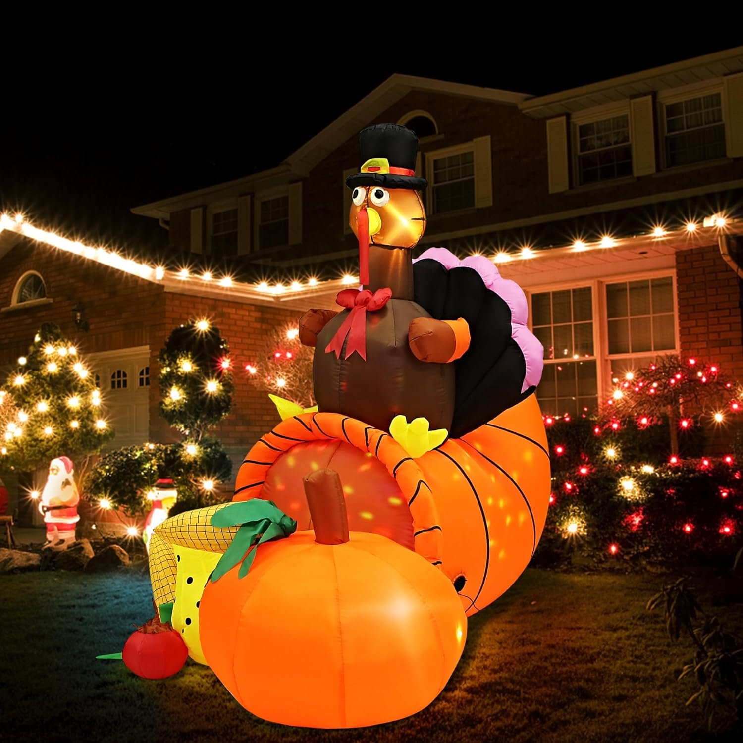 Fun & Unique 6FT Thanksgiving Inflatable – This blow up turkey is very cute and festive! Adorable inflatable turkey sitting on the cornucopia and veggies is a unique touch to stand out, and sets a terrific tone to enjoy this special holiday! Everyone in your neighborhood will love it.
