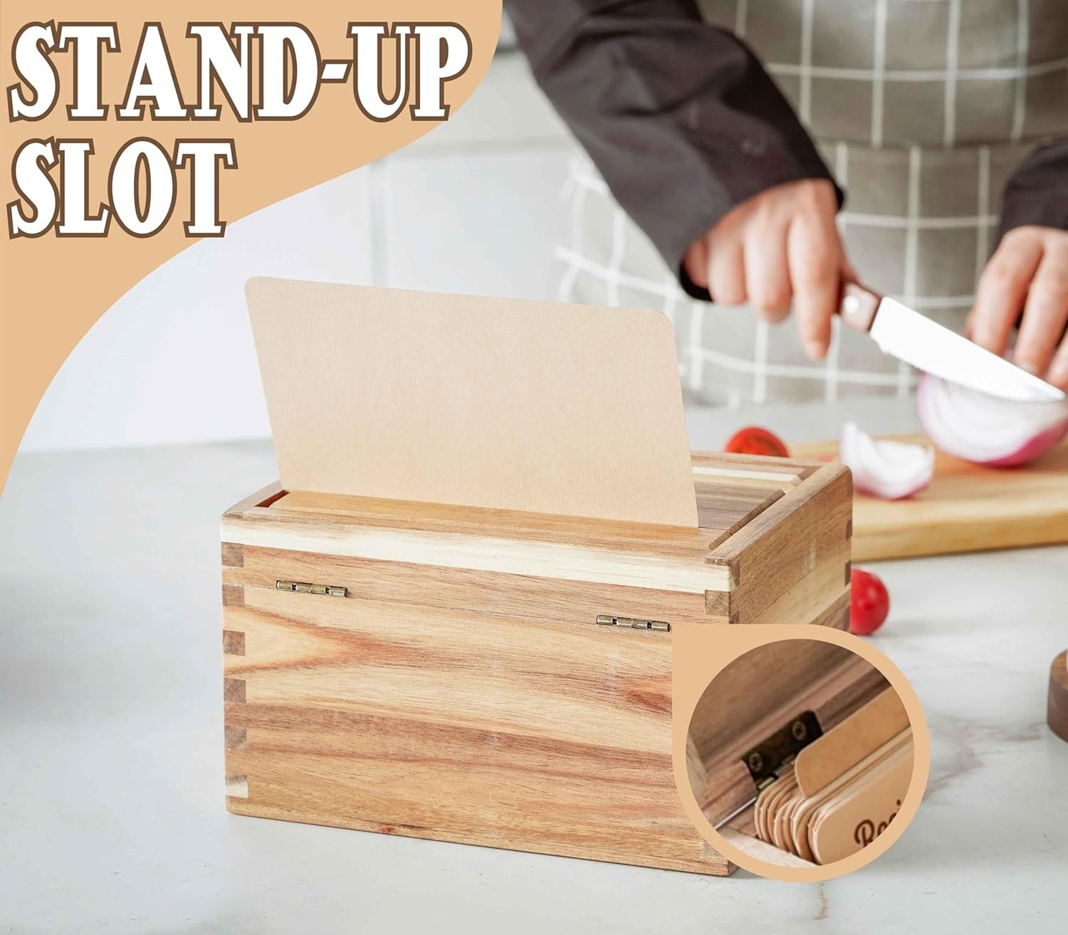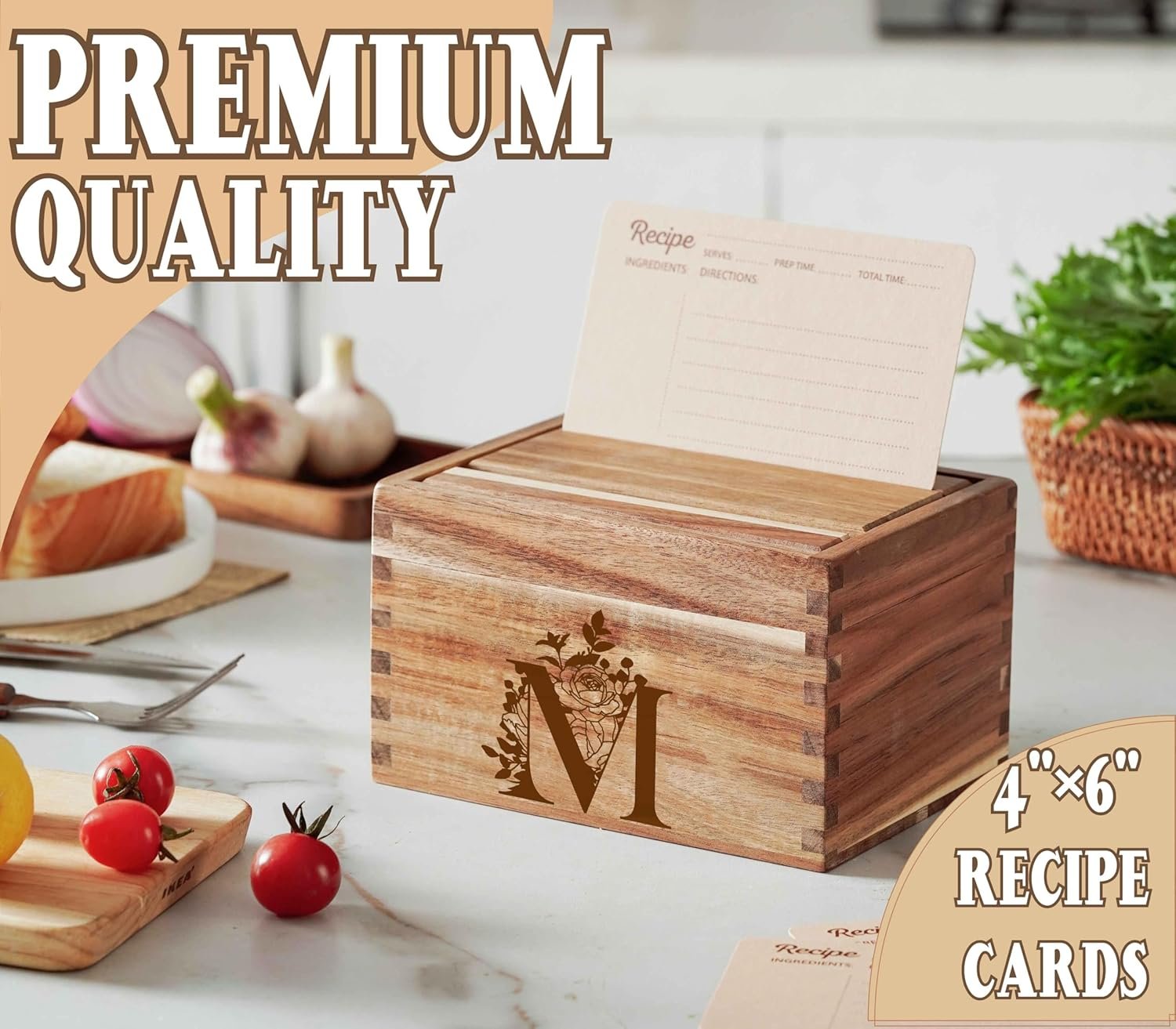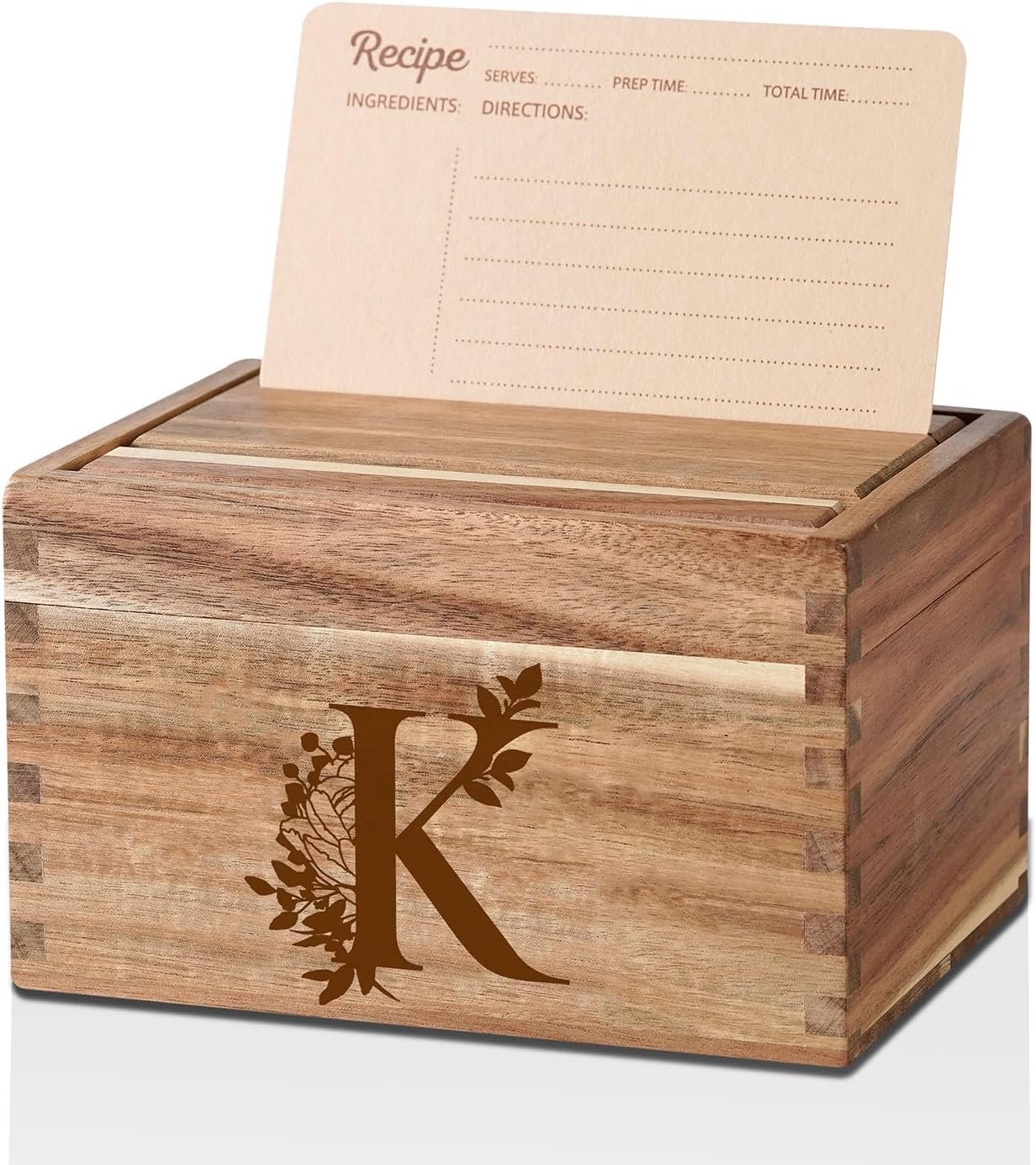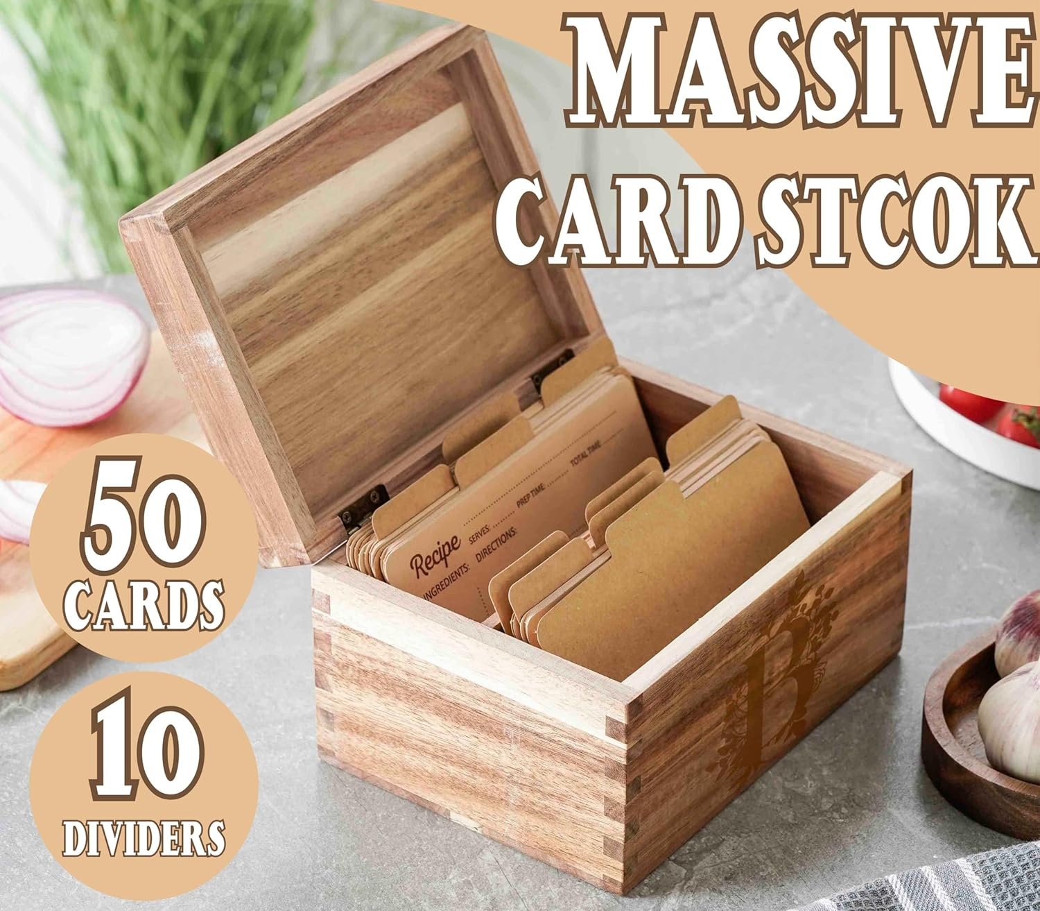 The recipe box comes with 50 4×6 recipe cards and 10 dividers.