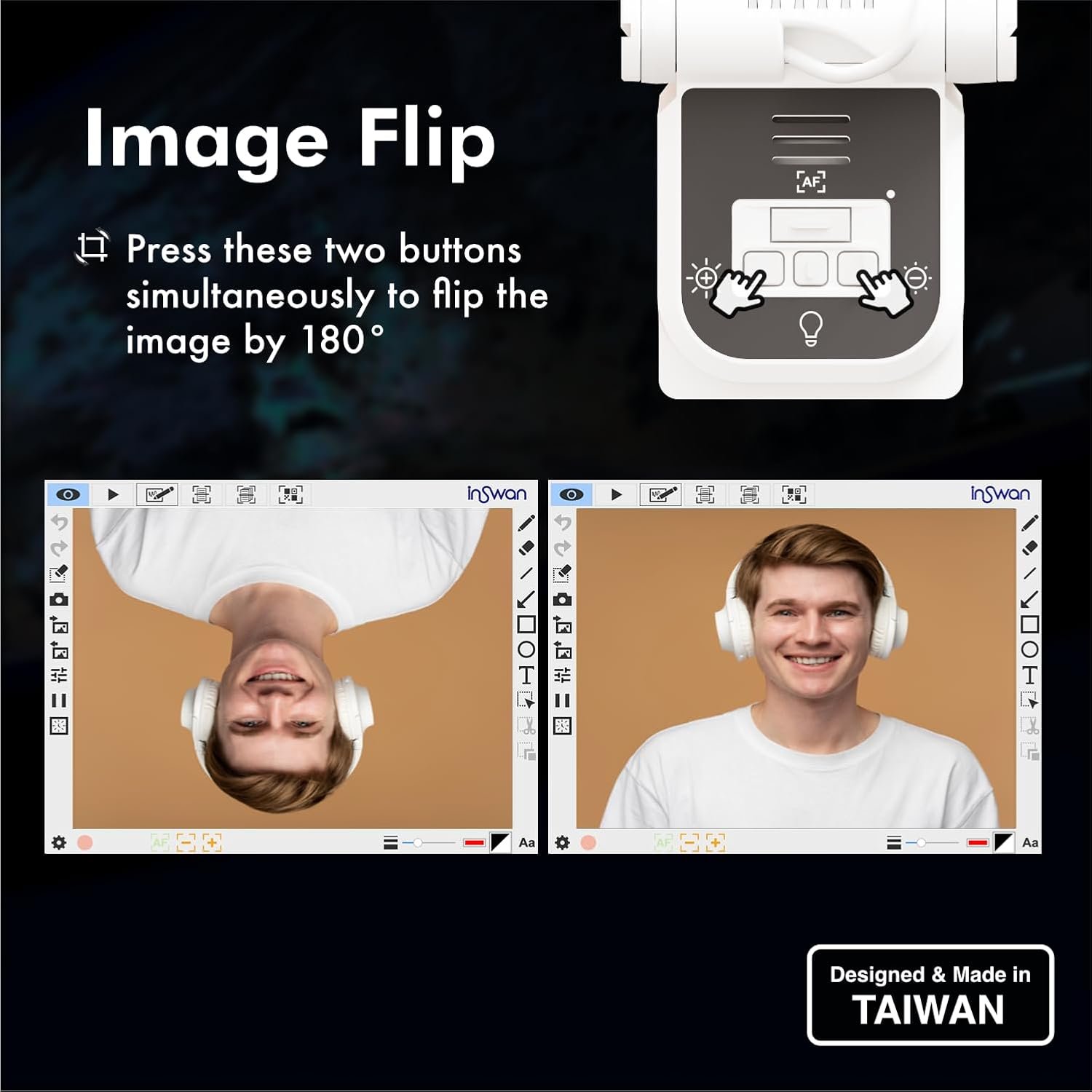 [2-in-1 Document Camera and Webcam] Use INS-Flip 4 as a document camera when you need to demonstrate solutions to using a pen and paper, share documents, books, worksheets, or show products & 3D objects in great detail or flip the camera to use it as a webcam for online meeting or web conference.
