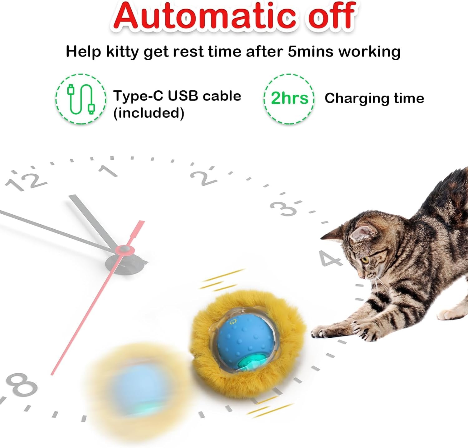 【Rechargeble 】 Newest cat ball come with type c cable,easily fully charge within 2-3hrs. ***Choose 5V/1A adapter will more compatiable. Lights RED when charge, turns on GREEN when fully charged, view user guide to get more detail