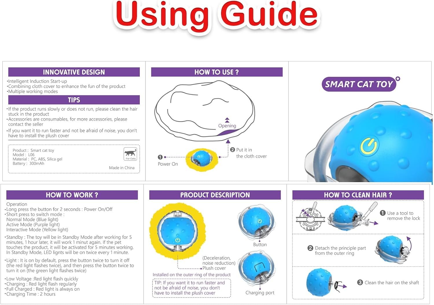 【Long press 5s to power on】 just distinguished the working mode by LED light. Fast rolling(blue light), Slow rolling(purple light), and interactive mode(yellow light). Under interactive mode, ball only active when cat pat it, responsive interaction gaming really gets their attention