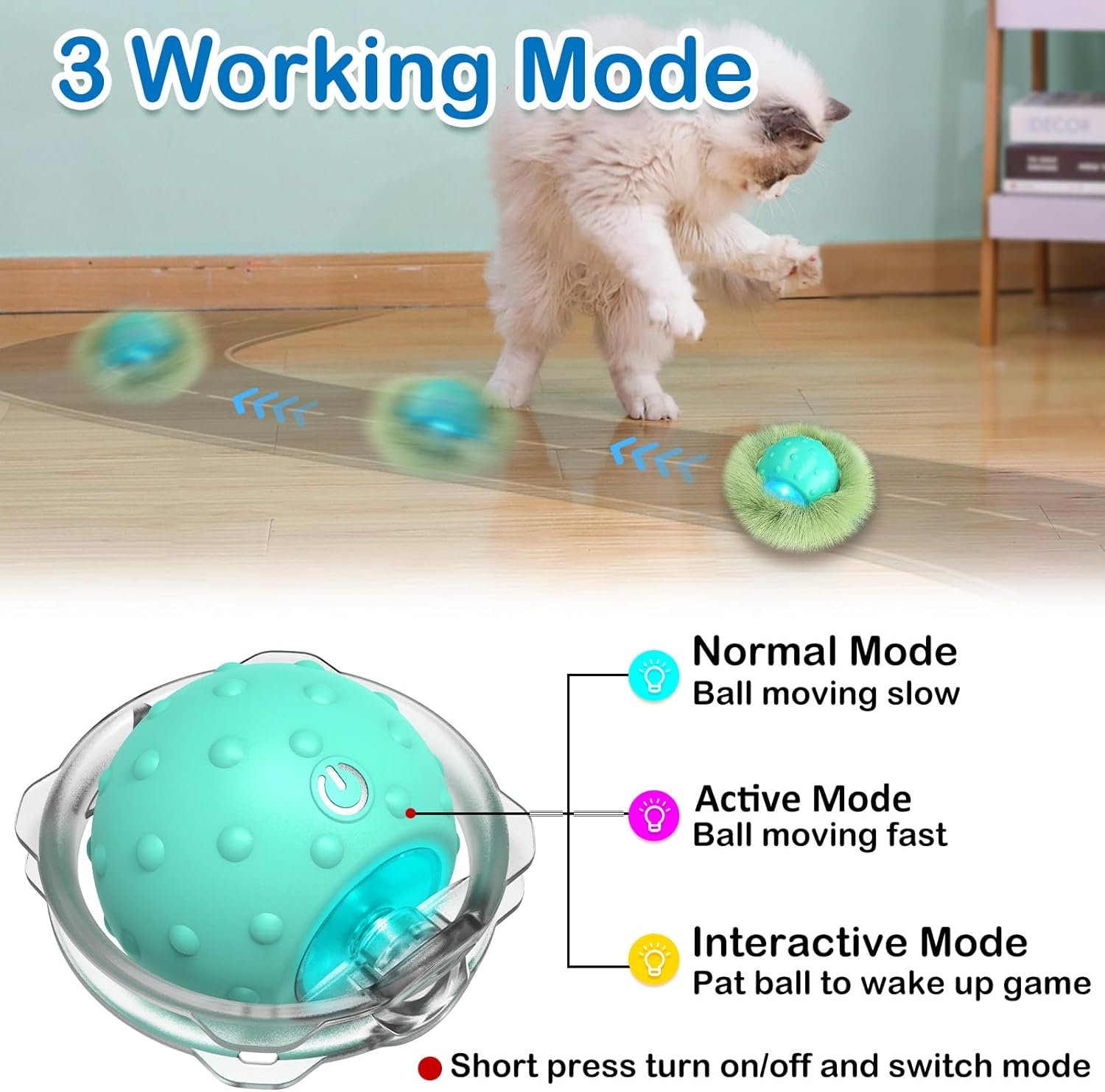 As a high energy cat toy ,Waaiio electric cat ball has 3 speed modes—slow(blue),fast(purple) and interactive(yellow) mode. Short press to switch mode and adapt to your cat’s play style