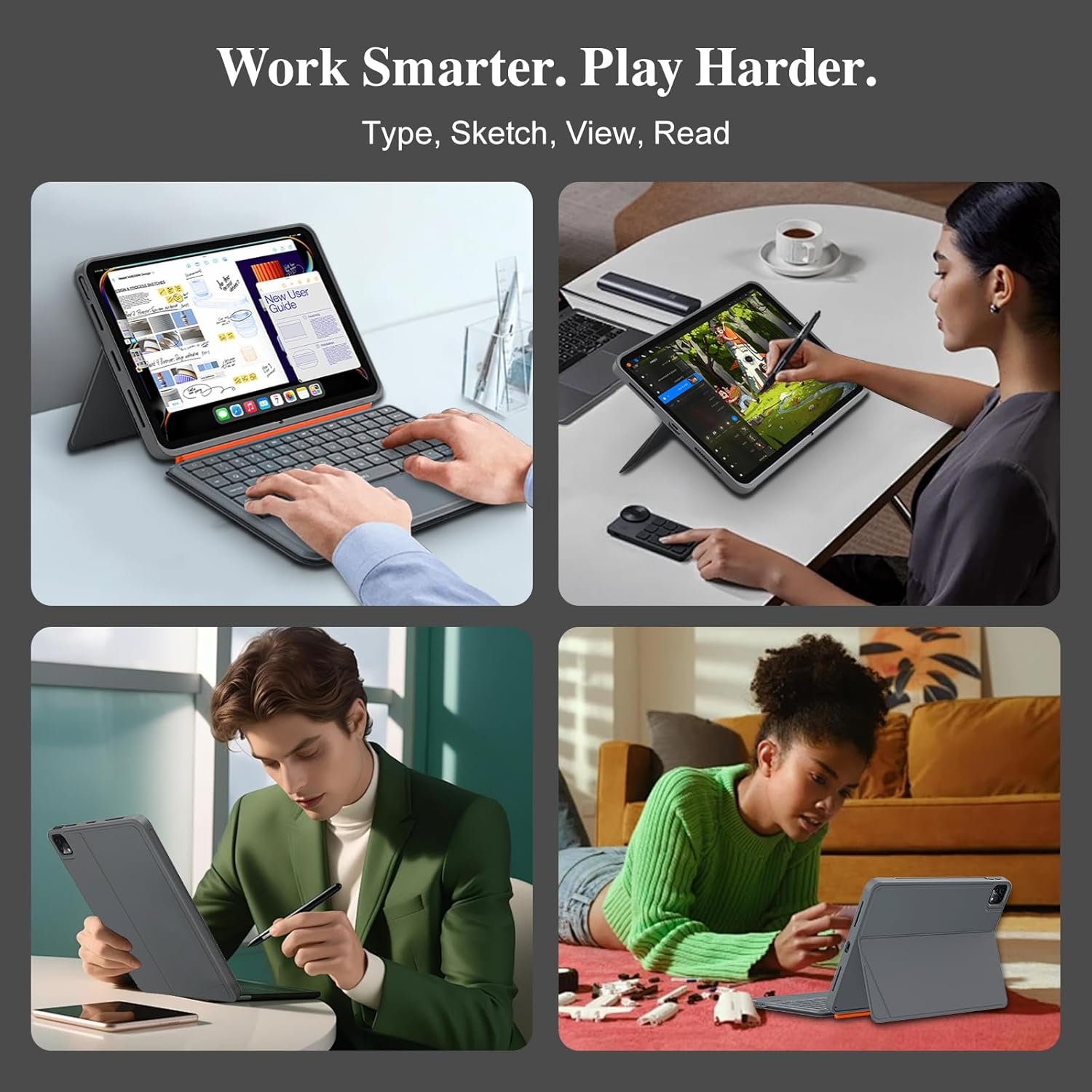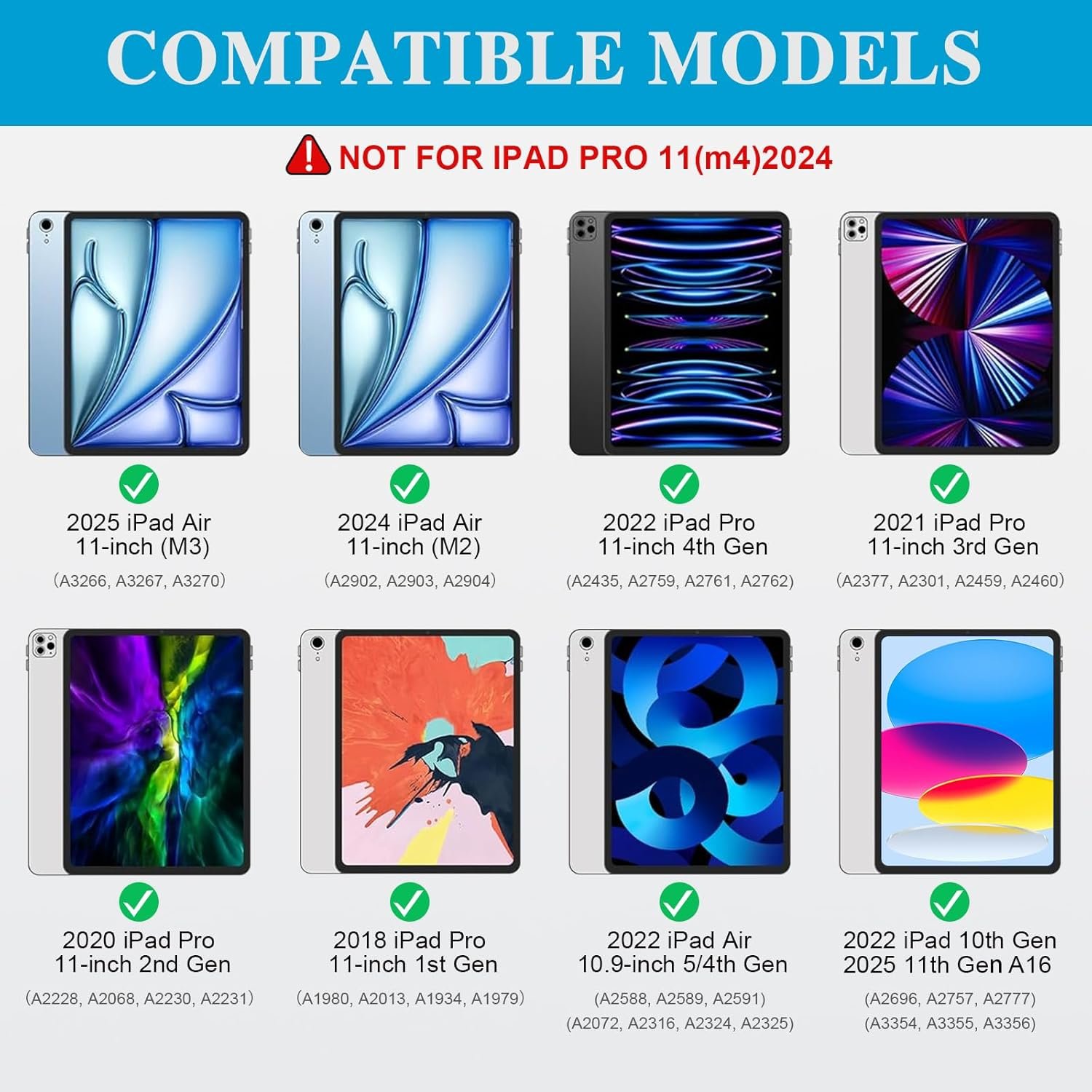 Versatile Compatibility: The iPad case with keyboard is compatible with iPad Air 11 inch (M3 M2, 2025 2024), iPad 11th Gen (A16, 2025), iPad 10th Gen (10.9 inch 2022), Air 5th/4th Gen 10.9 inch (2022 2021), Pro 11 inch 4th/3rd/2nd/1st Generation (2022 2021 2020 2018). Models include: A3354, A3355, A3356, A2696, A2757, A2777, A3162, A3266, A3267, A3270, A2902, A2903, A2904, A2435, A2759, A2761, A2762, A2377, A2459, A2301, A2460, A2228, A2068, A2230, A2231, A1980, A2013, A1934, A1979, A2588, A2589, A2591, A2316, A2324, A2325, A2072;