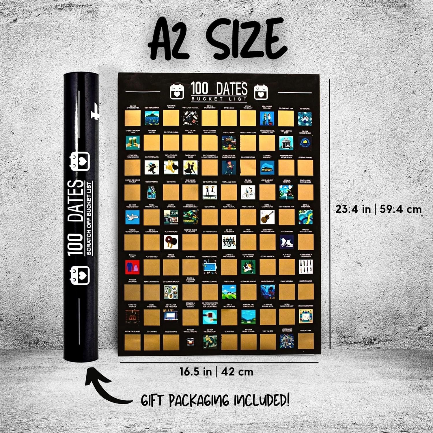 Adventure awaits with every scratch and a chance to create new memories and build a deeper connection with each other. Each time you scratch one of the 100 Date Ideas it reveals a way to add a little bit of spark into your relationship to help reignite the passion and celebrate your love for one another. Spend quality time together opening yourselves up to new experiences that can be fun, fancy, active, adventurous, romantic and more. There are even date ideas for stay-at-home activities that will set the mood for romance and the joy of being alone with the one that makes your heart beat faster. This 16” x 24” poster gives you 100 exciting date ideas that you can use as a bucket list to scratch off what you have already accomplished as a couple or start fresh and challenge yourselves to complete – imagine the fun as the two of you embark on this never-a-dull-moment journey. A great way to “Carpe Diem” or “Seize the Day” and add some joy and adventure into your relationship. Fun ideas like riding in a hot air balloon, visiting a food festival, taking a cooking class or going for a bike ride will bring the two of you closer together. An awesome “any occasion” gift for you and your significant other as a bucket list full of fun, relationship-building adventures.