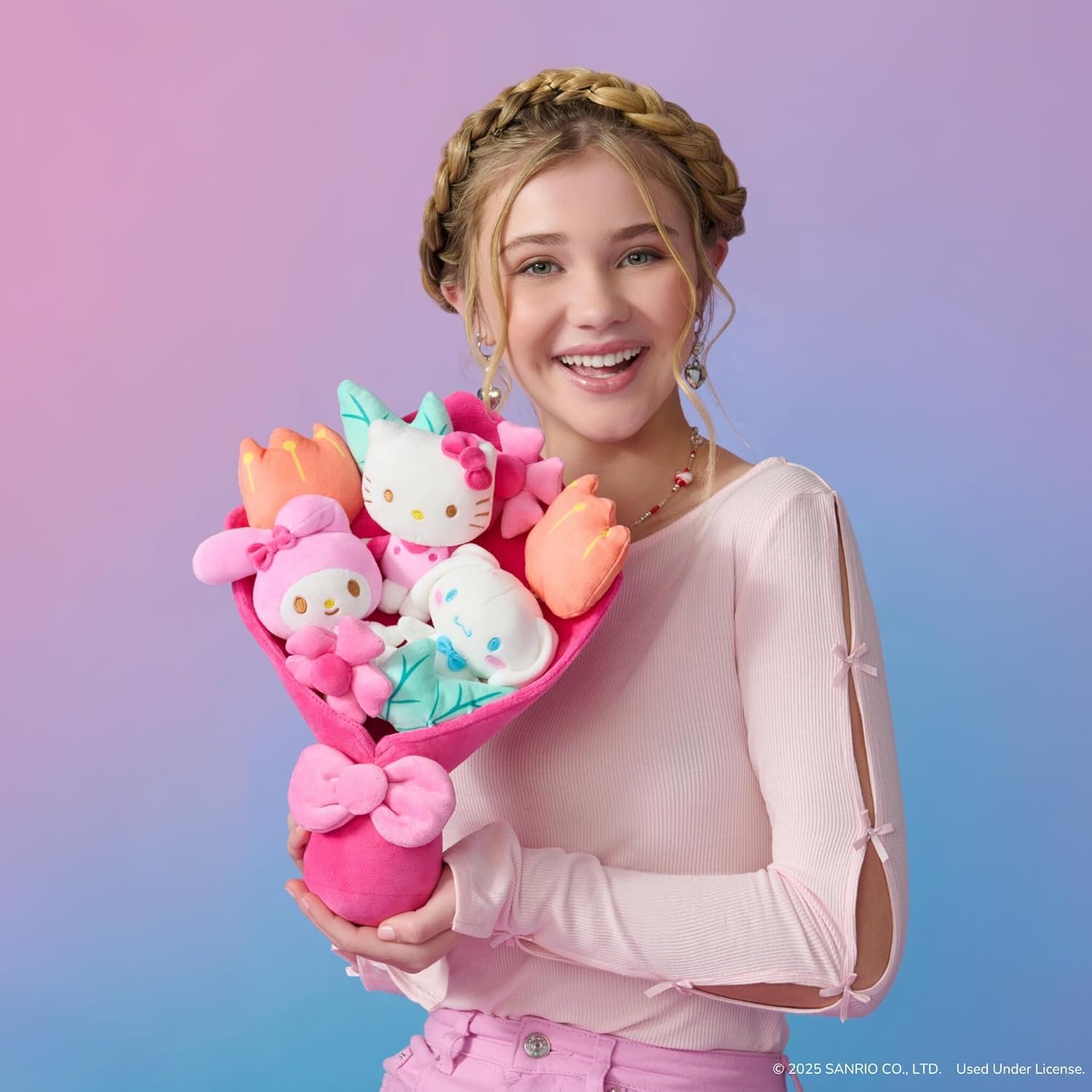 FLORAL ARRANGEMENT: This fabulous 12-inch plush bouquet is like a party in a bouquet with Hello Kitty, My Melody, and Cinnamoroll plush, surrounded by six colorful spring flowers; nine plush total